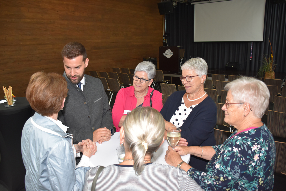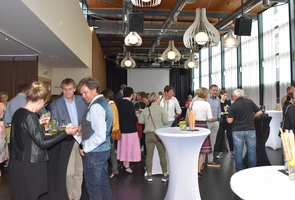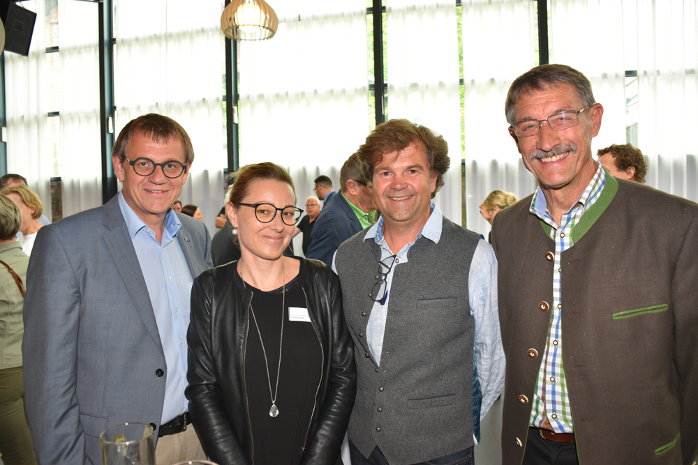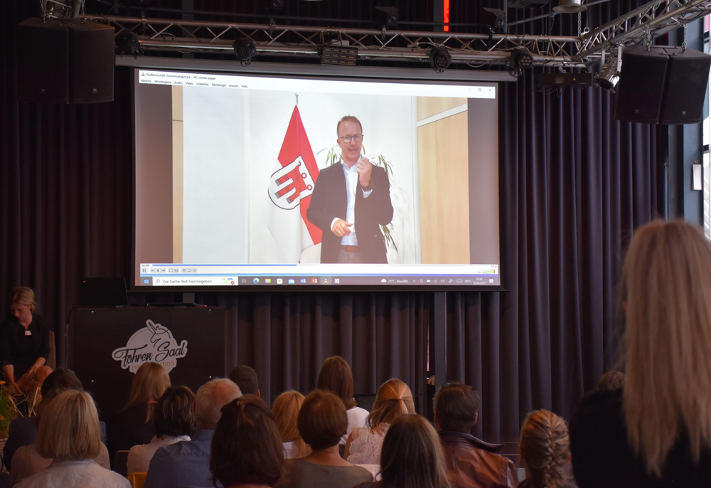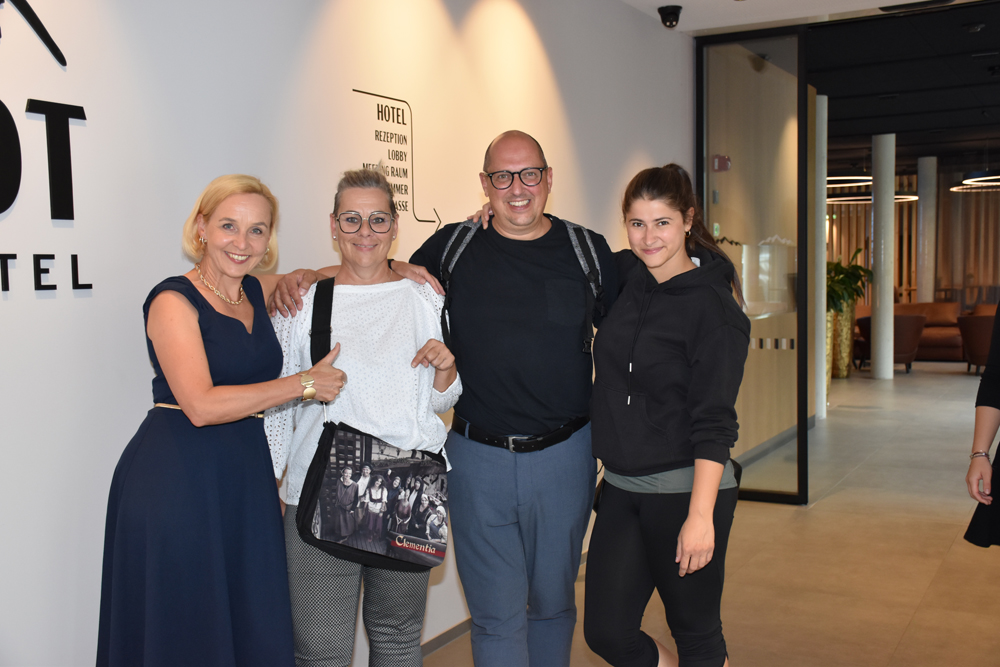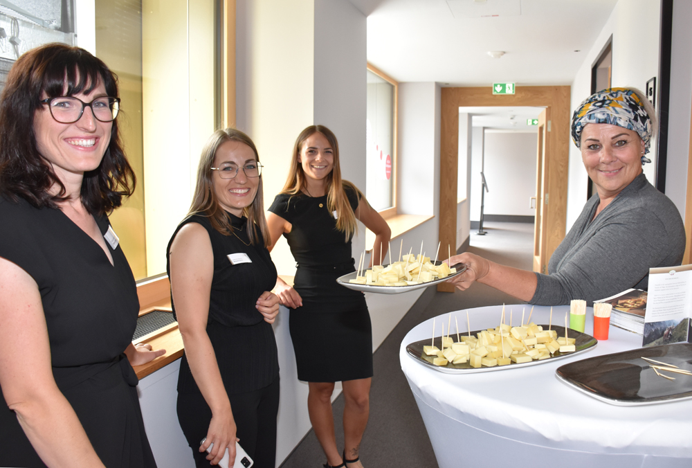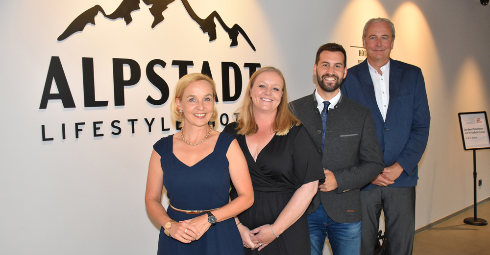 Gastgeber und Einlader des Tourismustag: Moderatorin Heike Montiperle (Pointen & Püree), Wiebke Meyer (GF Alpenregion Bludenz Tourismus), BM Simon Tschann (Präs. des Tourismusverbandes Alpenregion Bludenz), Gerald März (Vorarlberg Tourismus)