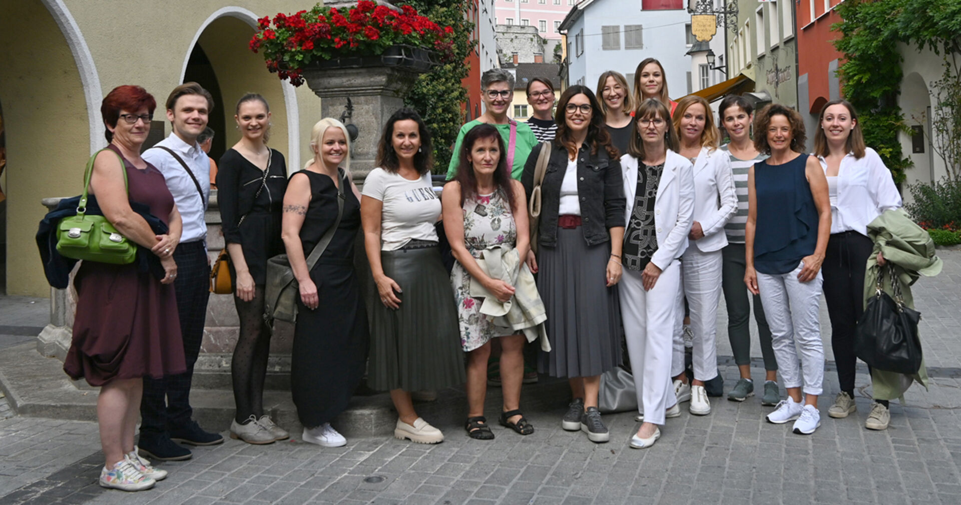 Gruppenfoto vor dem Nepumukbrunnen: Monika Wolf, Philipp Domenig, Julia Wolfesberger und Angelika Domenig von Aquarylic GmbH, Karin Furtner FIW, Christine Gabriel Änderungsschneiderei, Monika Wolf, Catherine Diethelm Bacibu Stoffwindeln, Andrea Mallitsch Vizebürgermeisterin Bludenz, Christiane Valtiner, Natascha Arzberger GF Stadtmarketing Bludenz, Julia Zambonin Jause-Pause Handles GmbH, Catrin Wendel Wendelevents, Jutta Mangeng FMTec, Ilga Schnell-Falch FMTec, Stefanie Wachter SinnesWandel (v. li.)