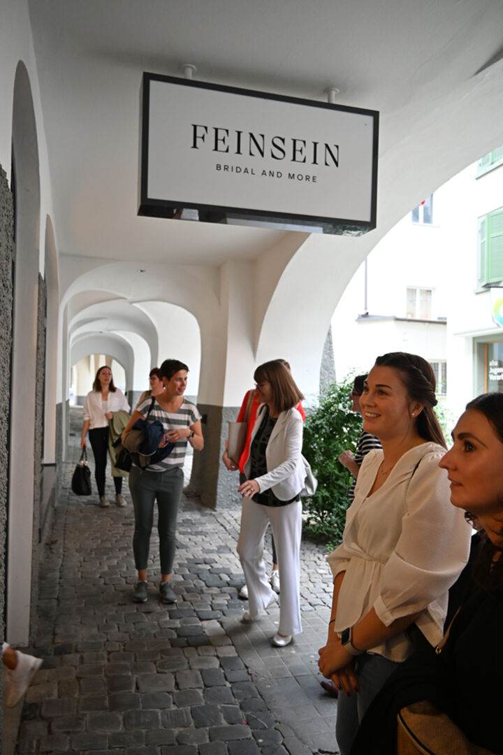 Gestartet wurde mit der Initiative „on tour“ bereits am Nachmittag, wo Gewerbeinitiativen von Bludenzer Unternehmerinnen näher vorgestellt wurden. Beginnend bei Jaqueline Woduschegg, welche unter dem Namen „Jackis Blumen“ nun schon seit 34 Jahren Blumengrüße zu den unterschiedlichsten Anlässen arrangiert und kreiert. Dann ging die Tour weiter zu den JUKAs Mädels, Juliana Rossnagel und Katharina Maier, die ihrerseits feinste Köstlichkeiten aus dem Ländle anbieten. Bis zu 109 verschiedene regionale Anbieter findet man so im Genussraum zentral in der Bludenzer Altstadt. Abschließend besuchten die Frauen on Tour noch Carmen Müller, die Geschäftsführerin des „Atelier Feinsein“. Das Modelabel wurde vor 1 ½ Jahren speziell für Brautmode- und Maßanfertigungsschneiderei gegründet.
