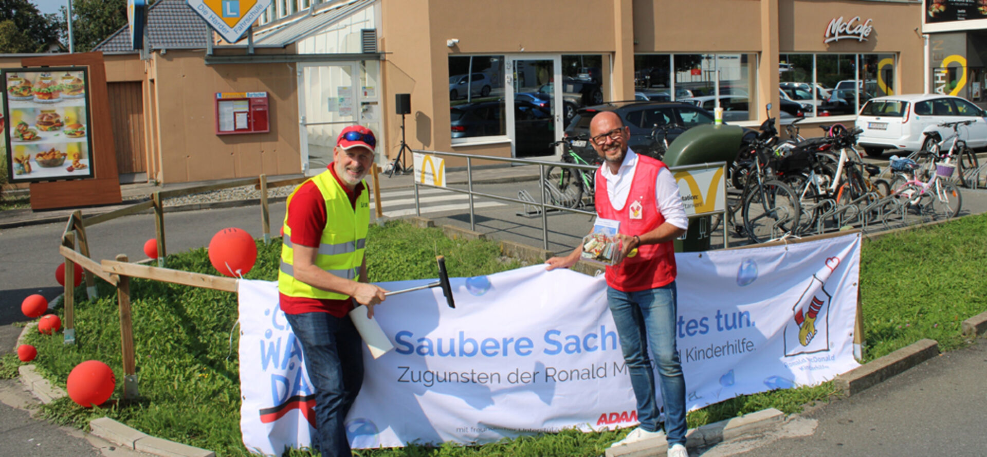 Gemeinsame Spendenaktion für die Ronald McDonald Kinderhilfe. Das Team um Loek Versluis mit Unterstützung der Bürgermeister Dieter Egger, Kurt Fischer, Michael Ritsch, Martin Staudinger griff für den guten Zweck zu Schwamm und Kübel.