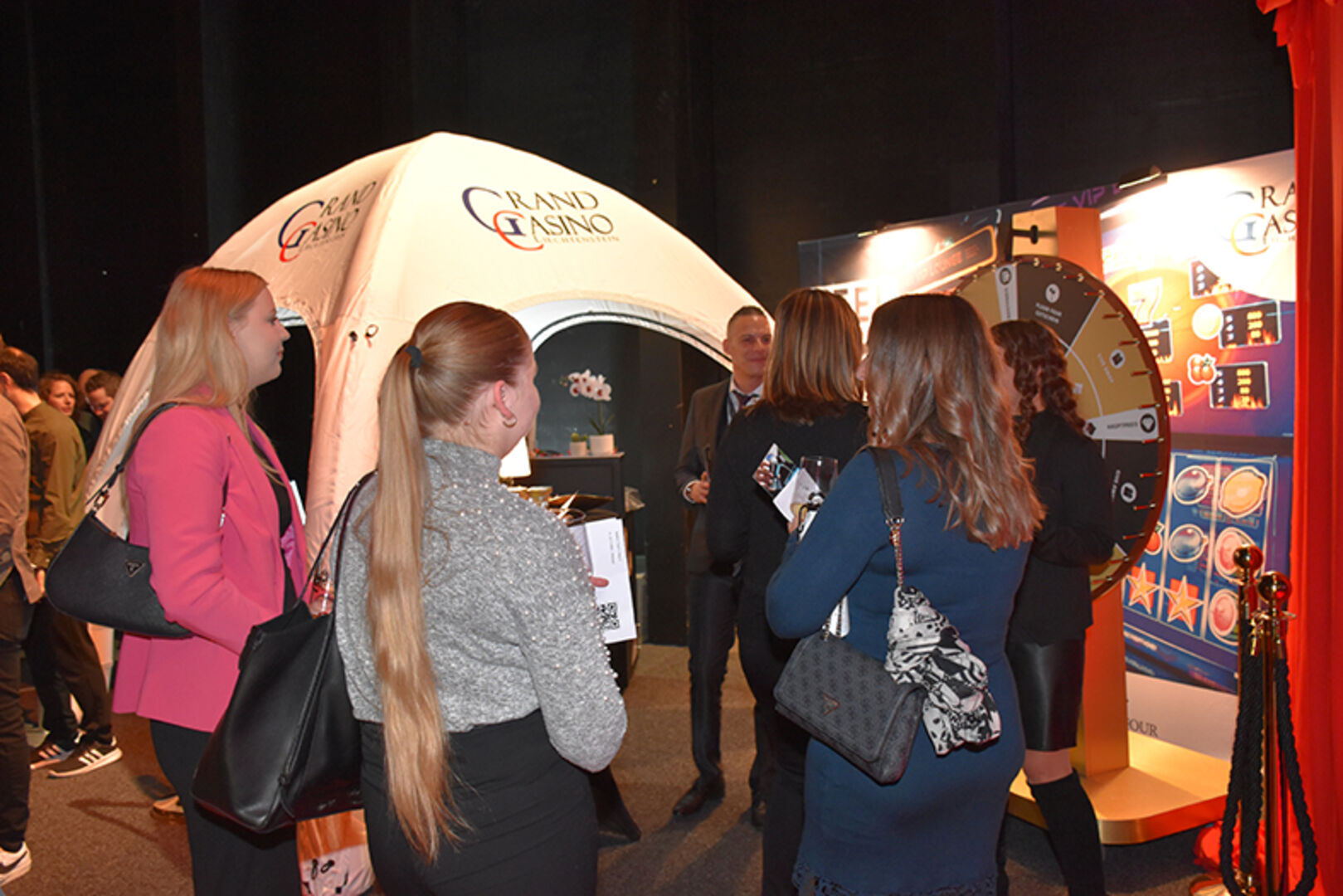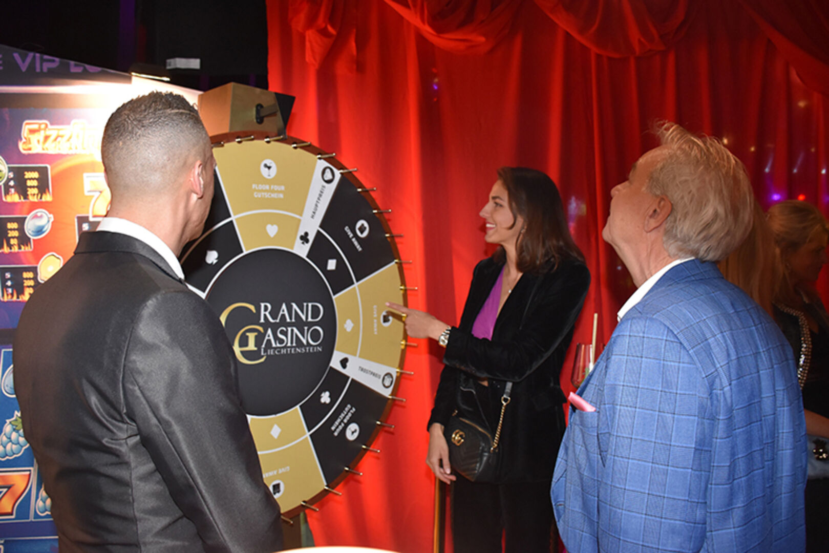 Alexandra Muchitsch (Stadt Bregenz) am Glücksrad mit Arnold Marcel (Grand Casino Liechtenstein)
