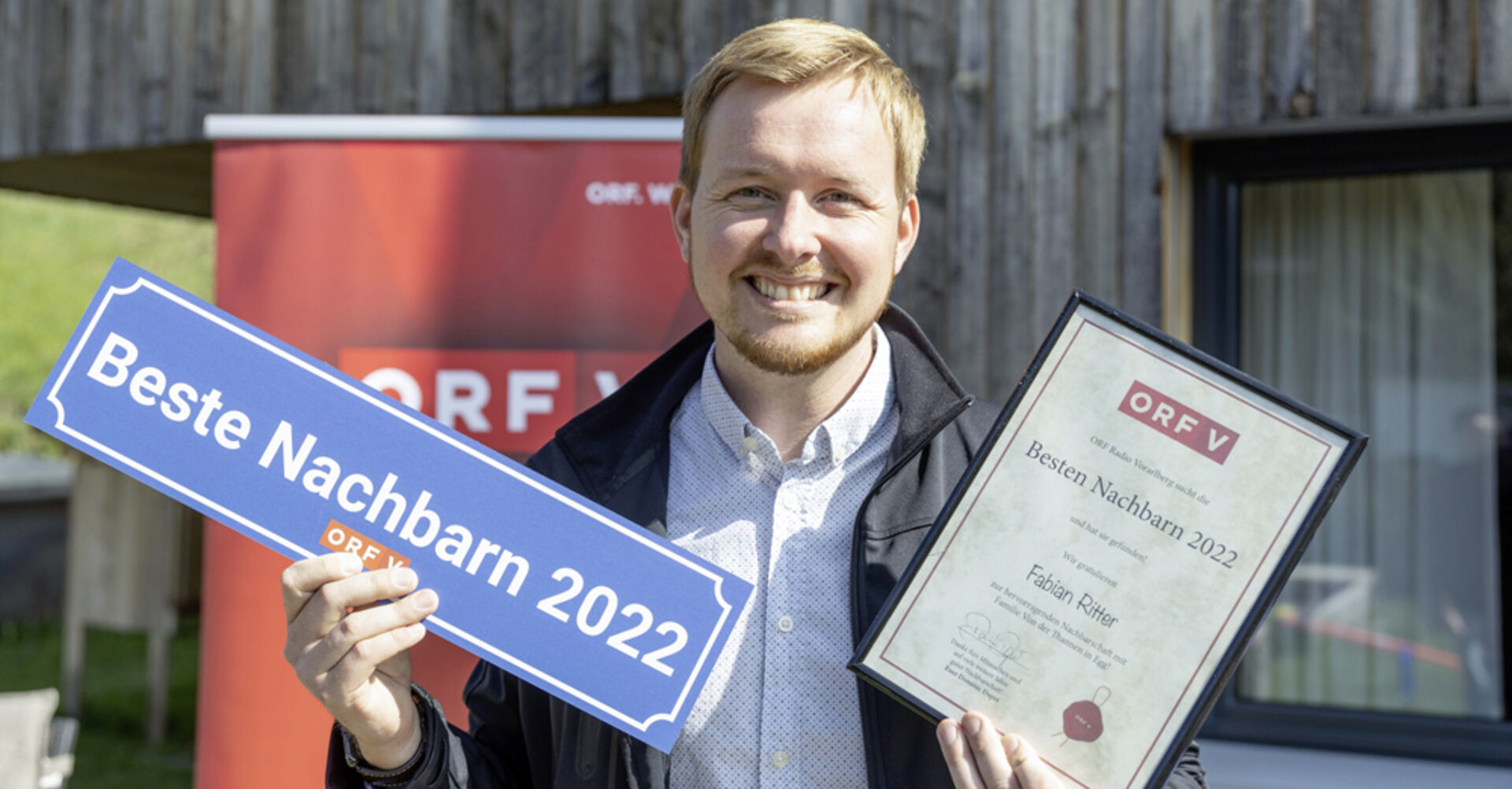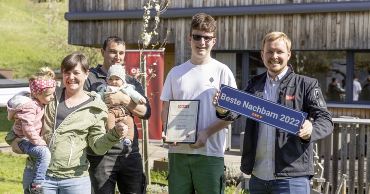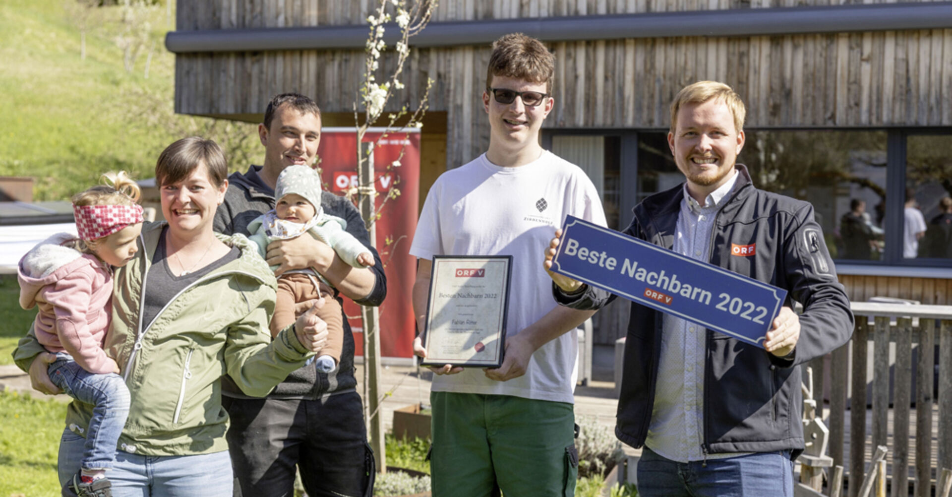 ORF Radio Vorarlberg-Moderator Dominic Dapré überraschte gemeinsam mit Familie Von der Thannen Gewinner Fabian mit der Überreichung des Titels „Beste Nachbarn Vorarlbergs 2022“. Als Dankeschön für die großartige Nachbarschaft und zur Erinnerung an diese Auszeichnung erhielt der Sieger ein „Beste Nachbarn 2022“-Straßenschild samt Urkunde und Einkaufsgutscheine.