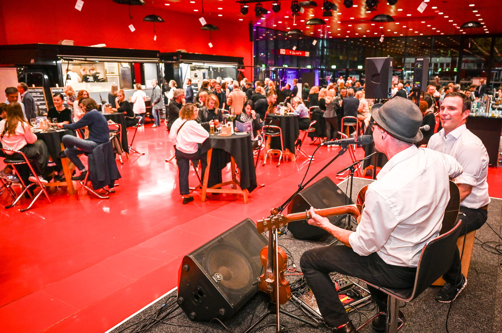 Musiker Philipp Lingg, Yvonne Schrott-Greussing (Leitung Marketing Messe) und Wirt Wolfi Preuss (Wirtschaft & Kulturhaus) (v. li.)