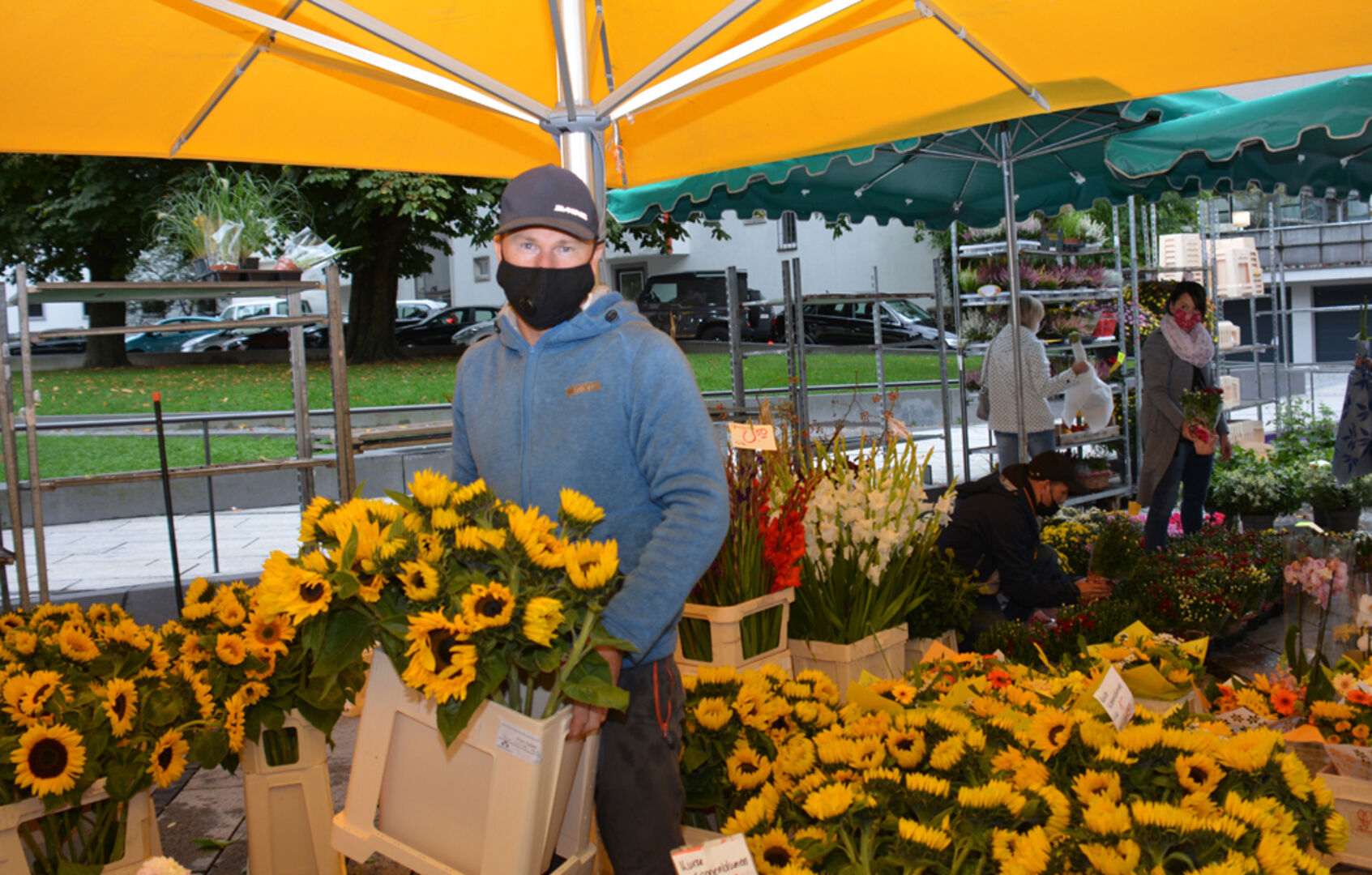 Anziehend ist die satte Blumenpracht auf dem Markt. Neben Blumen Frick aus Sulz gibt es einen Namensvetter aus Bürs, der ebenfalls seit langem den Markt mit Schnittblumen und Lebensfreude erfüllt: Andreas Frick ist schon von Kindesbeinen an auf Wochenmärkte mitgegangen – schließlich ist seine Familie seit 1980 bereits fixer Bestandteil auf dem Dornbirner Markt. Zuerst war es der Vater und seit sein Bruder Silvano mit ihm im Jahr 2001 die Gärtnerei „Evergreen“ in Bürs übernommen hat, teilen sich die Brüder die Geschäftsführung. Blumen aus der eigenen Gärtnerei und direkt gelieferte holländische Ware erfreuen die Marktbesucher.
