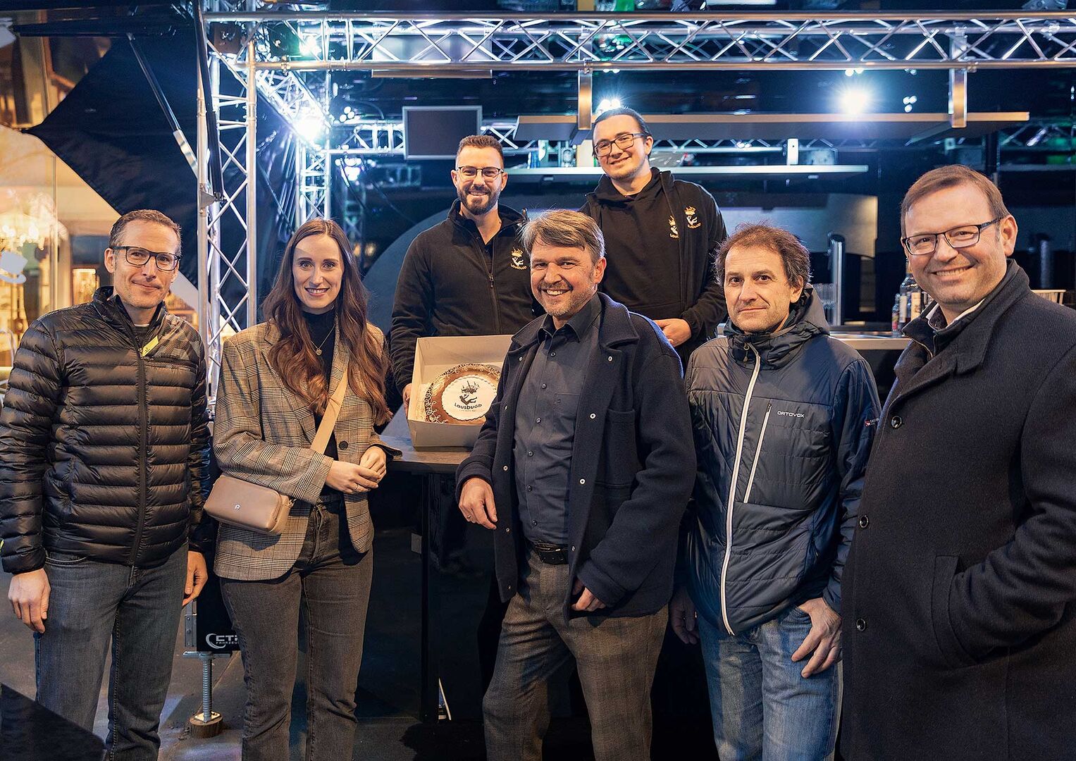 Bild oben: Zur Eröffnung überreichte Bürgermeister Kurt Fischer mit seinem Team eine Lausbuöb-Torte. Manuel Müller, Nathalie Heinisch, Sandro Wölfl, Bürgermeister Kurt Fischer, Lucas Fussenegger, Heinz Ropele, Vizebürgermeister Daniel Steinhofer (v. li.)