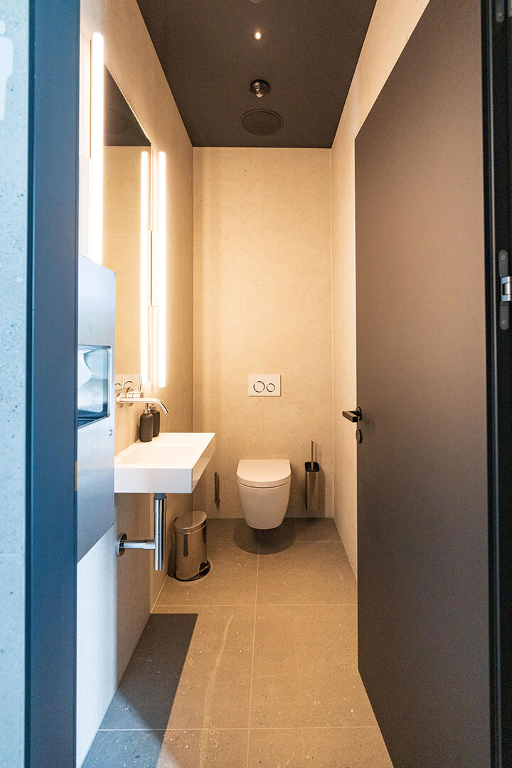 Für einen angenehmen Aufenthalt gibt es im Lounge-Bereich modern ausgestattete Sanitärräume sowie eine gut sortierte Auswahl an Erfrischungsgetränken und Snacks.