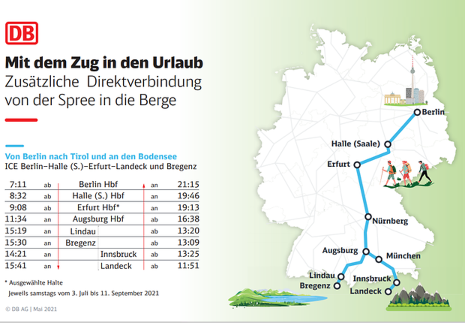 Vom 3. Juli bis 11. September 2021 bietet die Bahn erstmals eine komfortable Direktverbindung von Berlin nach Lindau und Bregenz an. Die ICE-Züge verkehren immer Samstagmorgen ab Berlin, in Augsburg wird der Zug dann geteilt: Ein Zugteil fährt weiter nach Tirol (über München, Kufstein, Wörgl, Jenbach und Innsbruck ins Ötztal, Imst-Pitztal und nach Landeck-Zams), der andere Zugteil fährt über die erst kürzlich elektrifizierte Allgäubahn an den Bodensee und nach Vorarlberg (über Geltendorf, Buchloe, Memmingen nach Lindau-Reutin und Bregenz). Umsteigefrei erreicht der ICE aus der Hauptstadt den Bodensee in knapp acht Stunden, die Berge in rund achteinhalb Stunden. Zurück starten beide Zugteile ebenfalls samstags zur Mittagszeit in Bregenz bzw. Landeck, werden in Augsburg wieder zusammengeführt und erreichen am Abend Berlin. Alle Züge sind ab sofort buchbar, Fahrten bis Bregenz ab Ende Mai.