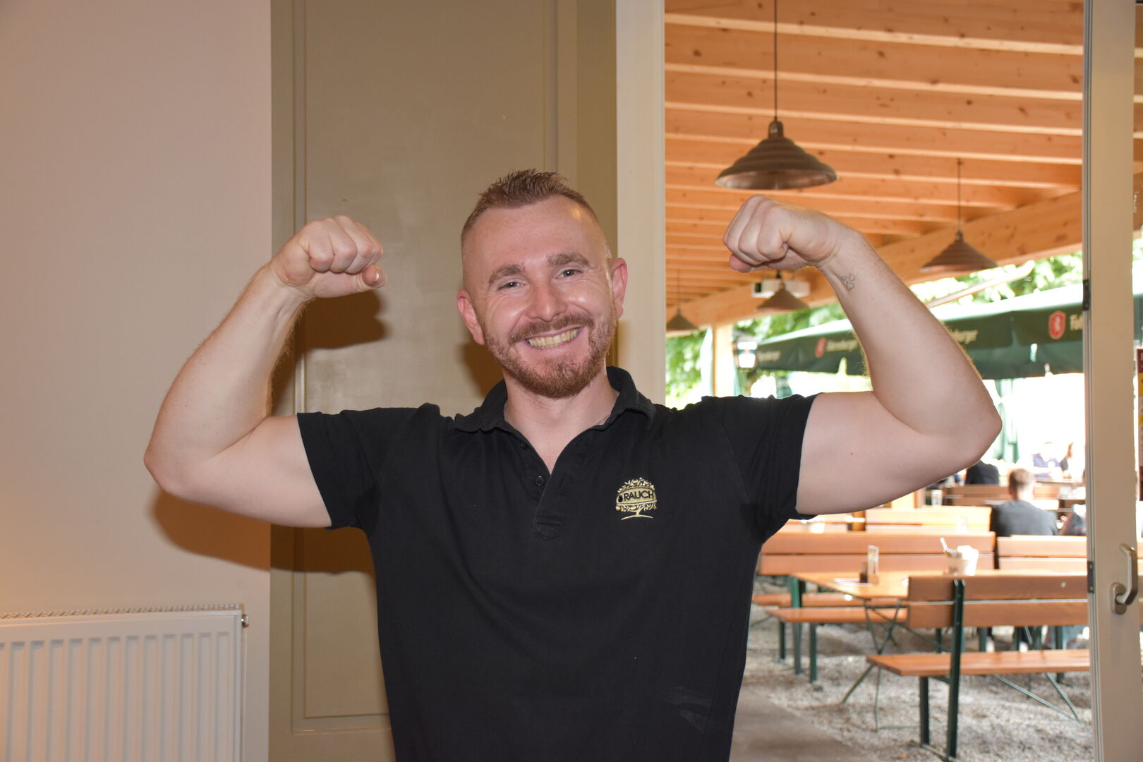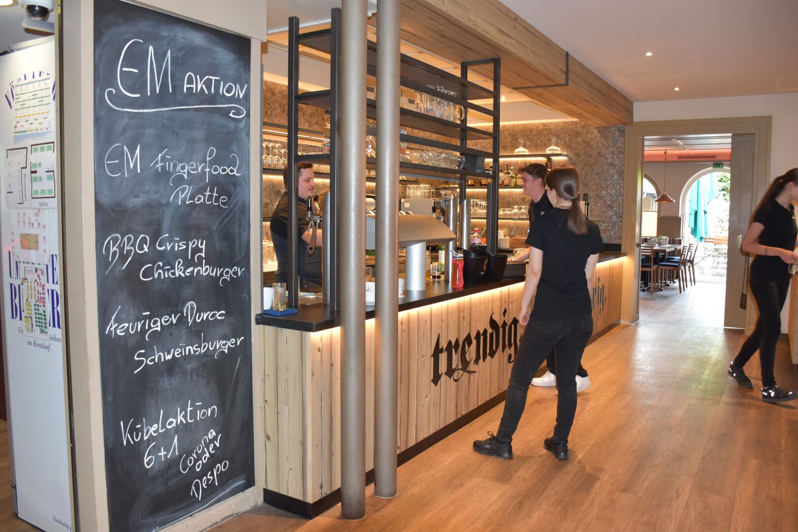Im Bild oben; Bei jedem Tortreffer der österreichischen Mannschaft gibt es einen Gratis-Shot für alle Gäste: Fohrencenter- und Kohldampfwirt Bernd Wilfinger mit Serviceleiterin Hanna