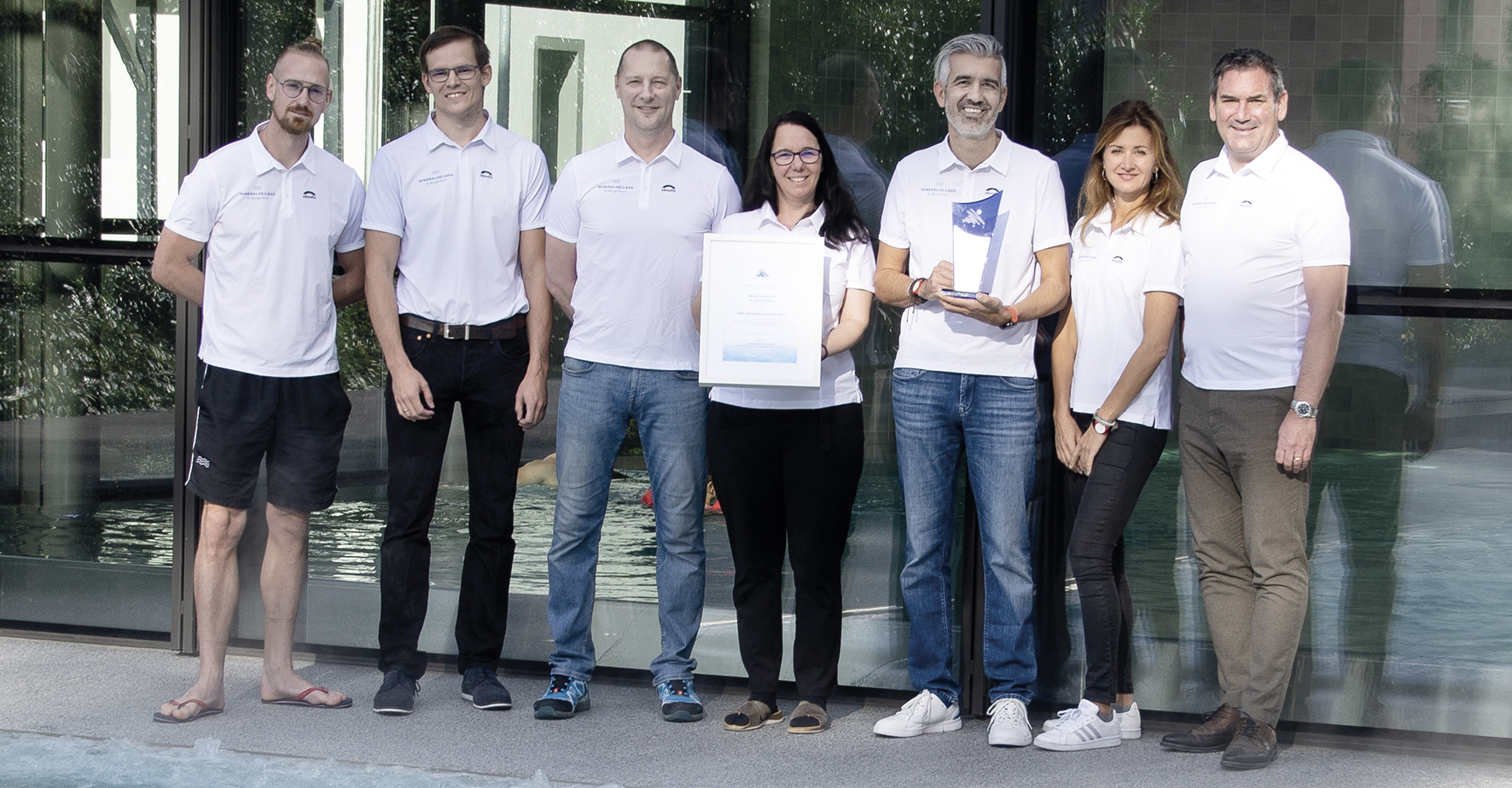 Freuen sich über den Gewinn des „EWA Marketing Awards“ 2021, von links: Robert Heinevetter (Leiter Bad & Sauna), Matthias Friess (Leiter Umsetzung Mineralien-Strategie), Tobias Ohmke (Leiter Technik), Sybille Freund (Leiterin Personal und Administration), Michael Benvenuti (Leiter Kommunikation), Sanja Bodenmann (Leiter Marketing) und Verwaltungsratspräsident Dr. Martin Meyer.