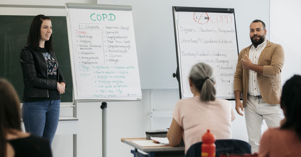 „Unsere Schule bietet innovative Unterrichtsformen in kleinen Lerngruppen. Individuelle Unterstützung beim Lernen ist uns ein Anliegen.“ Sandra Blaha, BA Direktorin der Pflegeschule Unterland