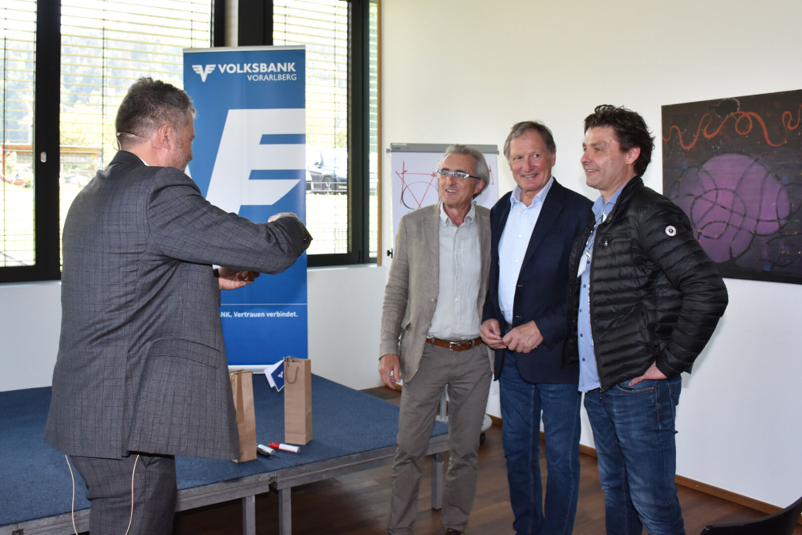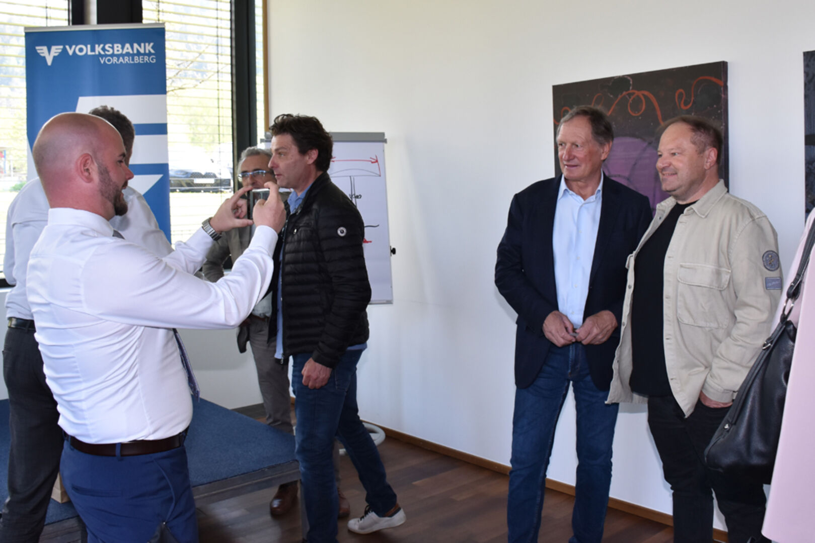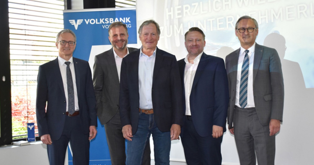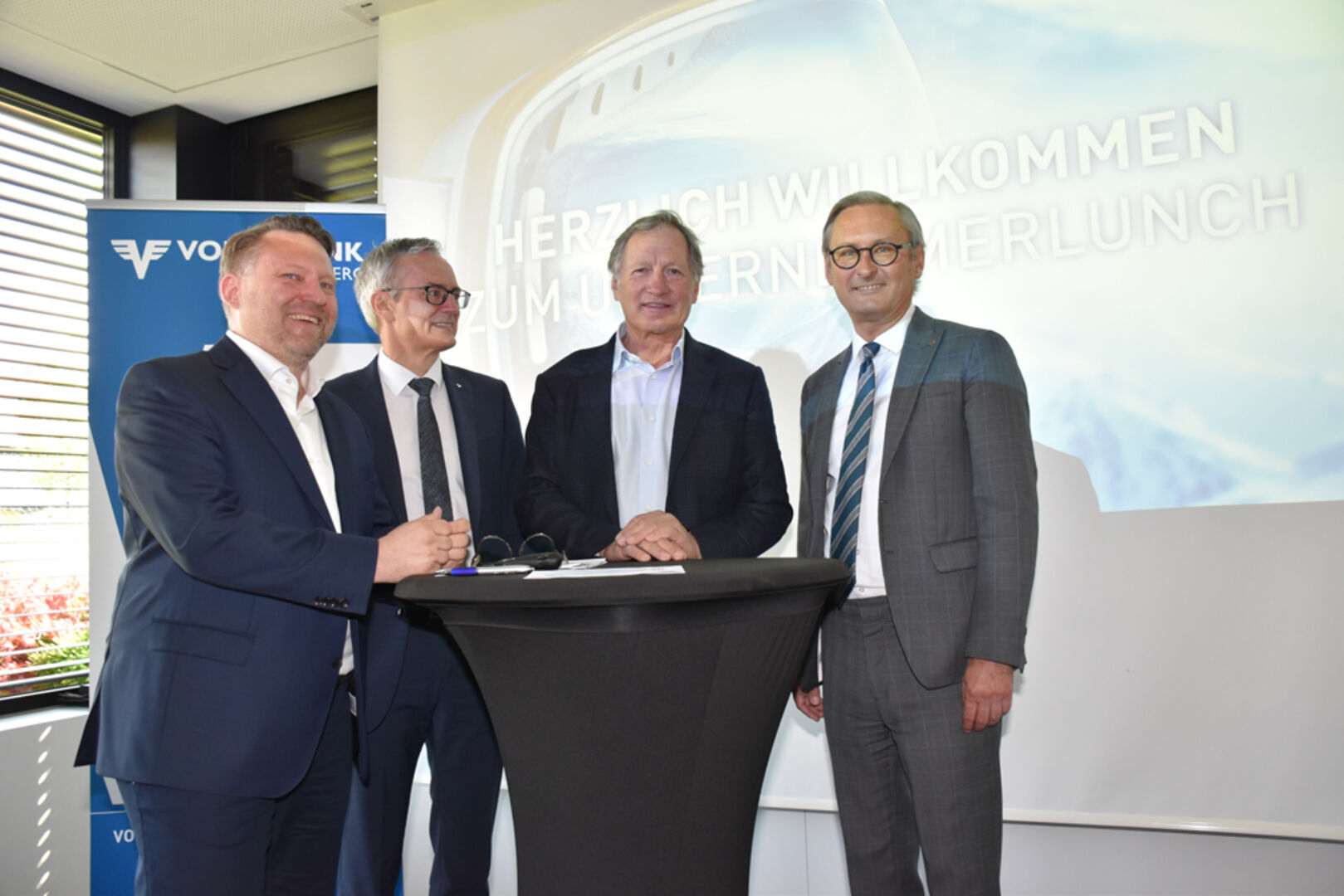 Volksbank-Vorstandsdirektor Helmut Winkler, Unternehmensberater Herbert Loos, Interviewgast Skilegende Franz Klammer, Unternehmerlunch-Moderator Ralf Patrik Gunz und Volksbank-Vorstandvorsitzender Gerhard Hamel.