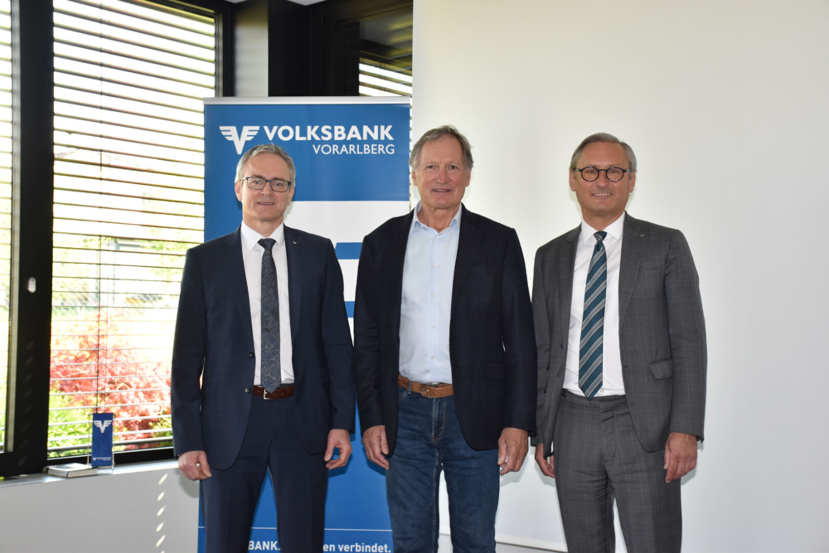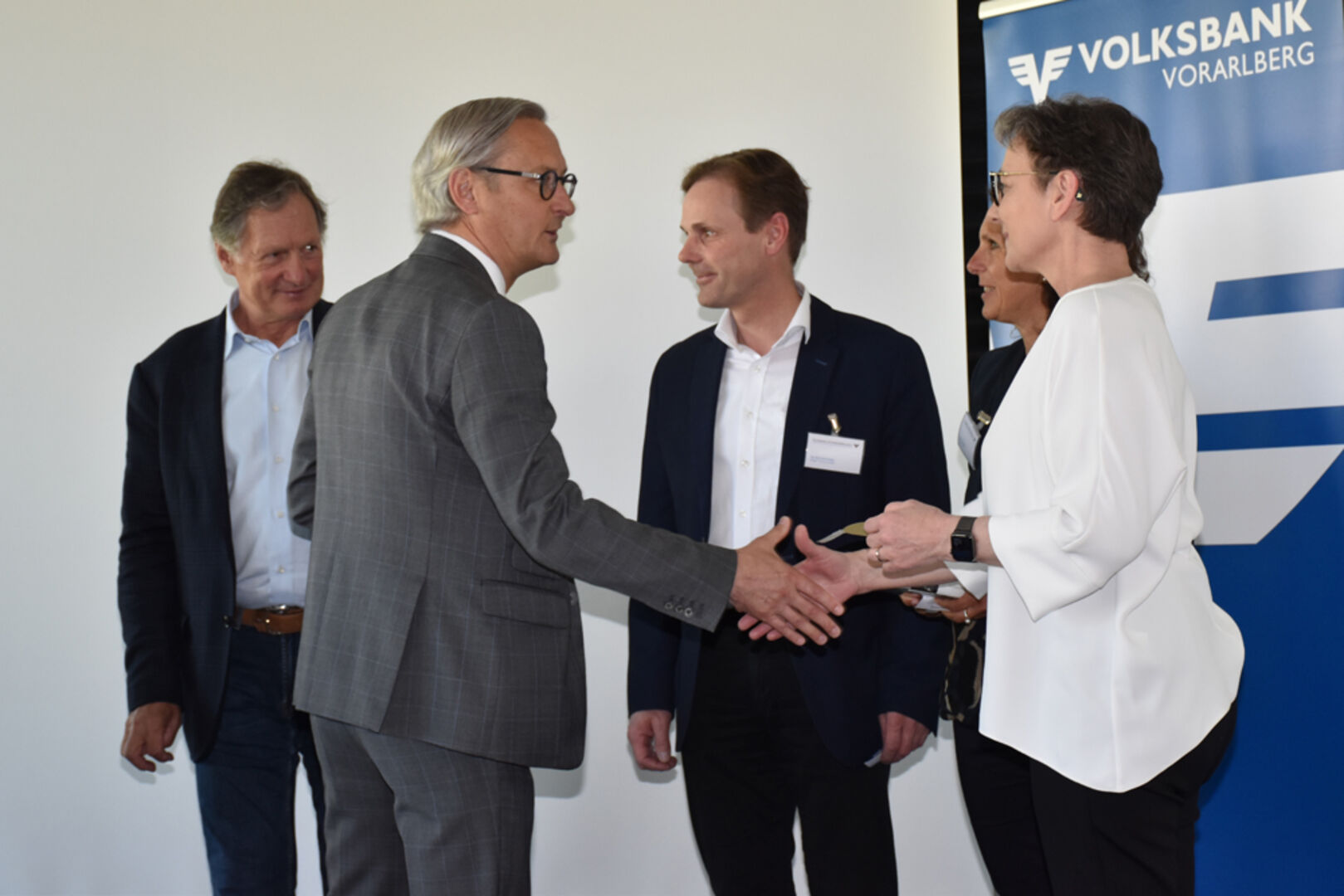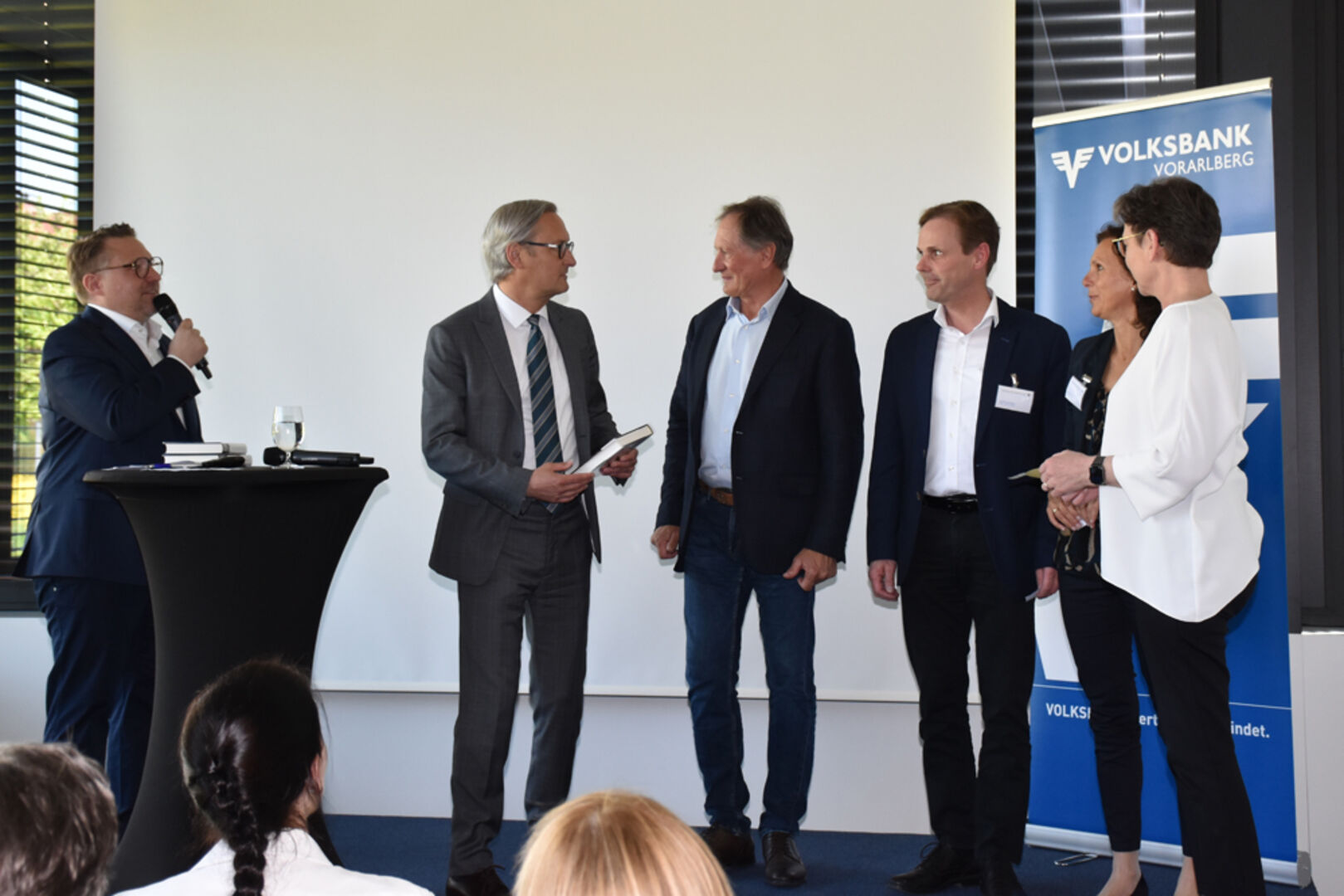 Volksbank-Vorstandsdirektor Helmut Winkler, Unternehmensberater Herbert Loos, Interviewgast Skilegende Franz Klammer, Unternehmerlunch-Moderator Ralf Patrik Gunz und Volksbank-Vorstandvorsitzender Gerhard Hamel.