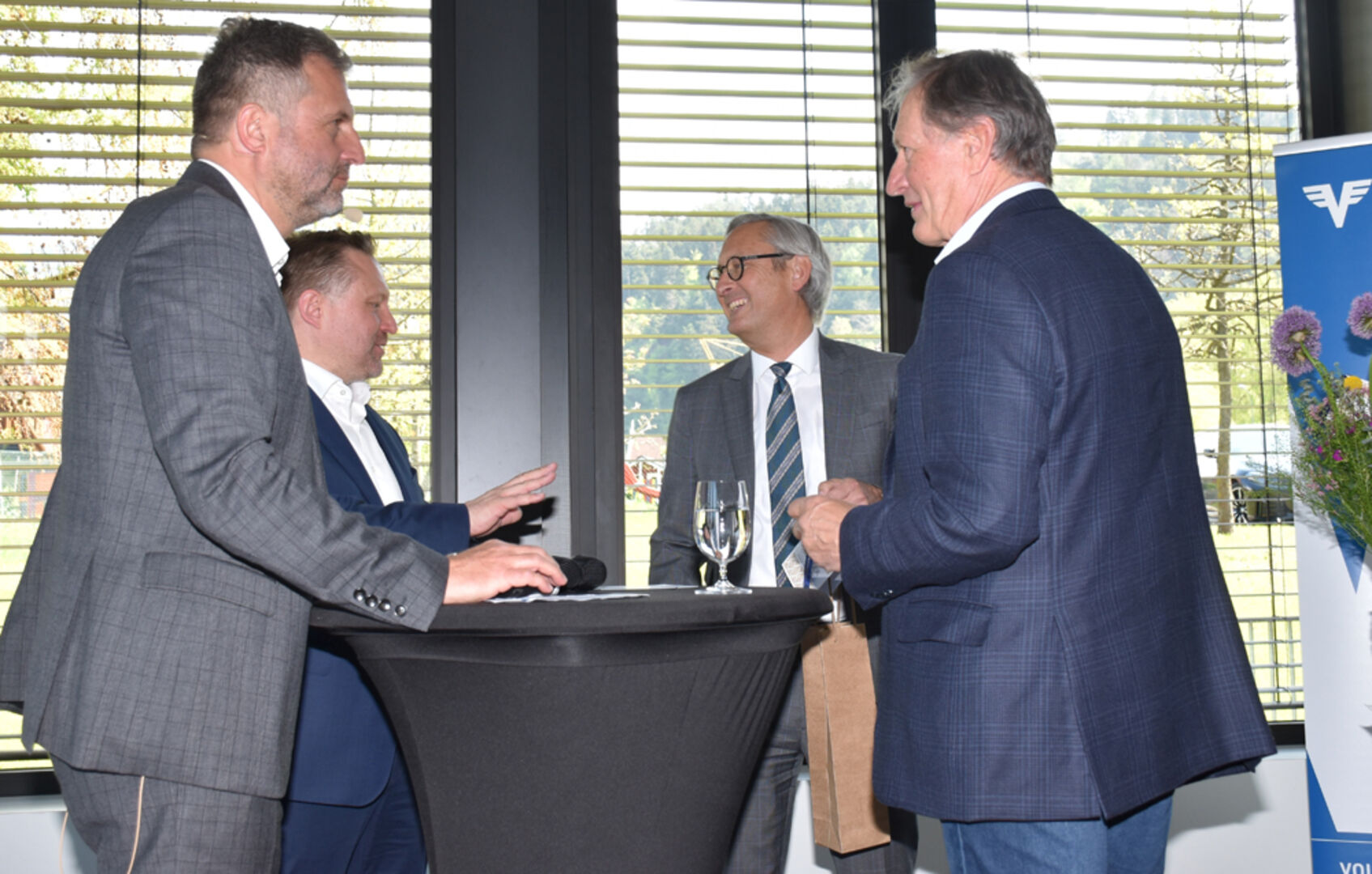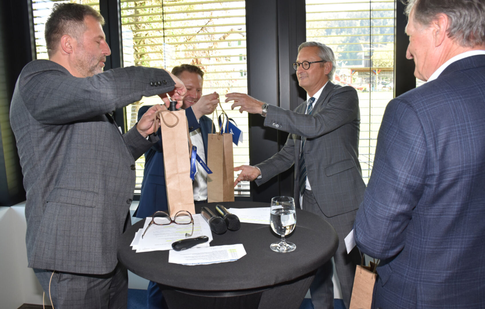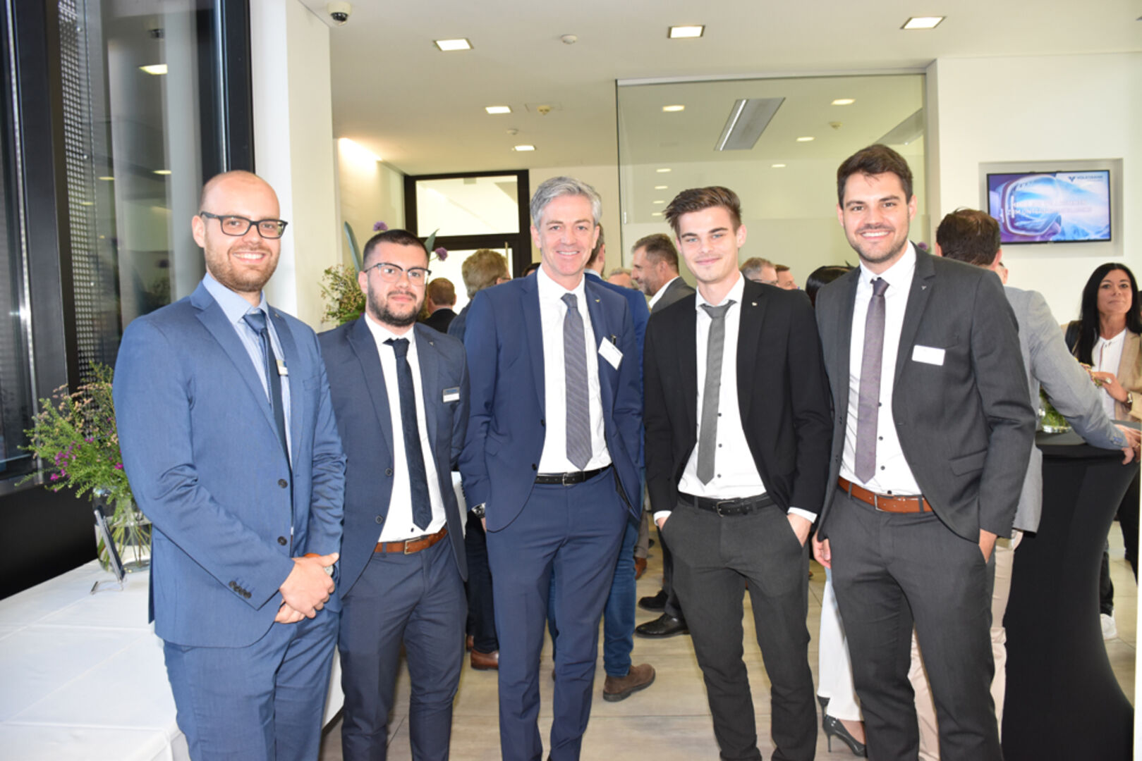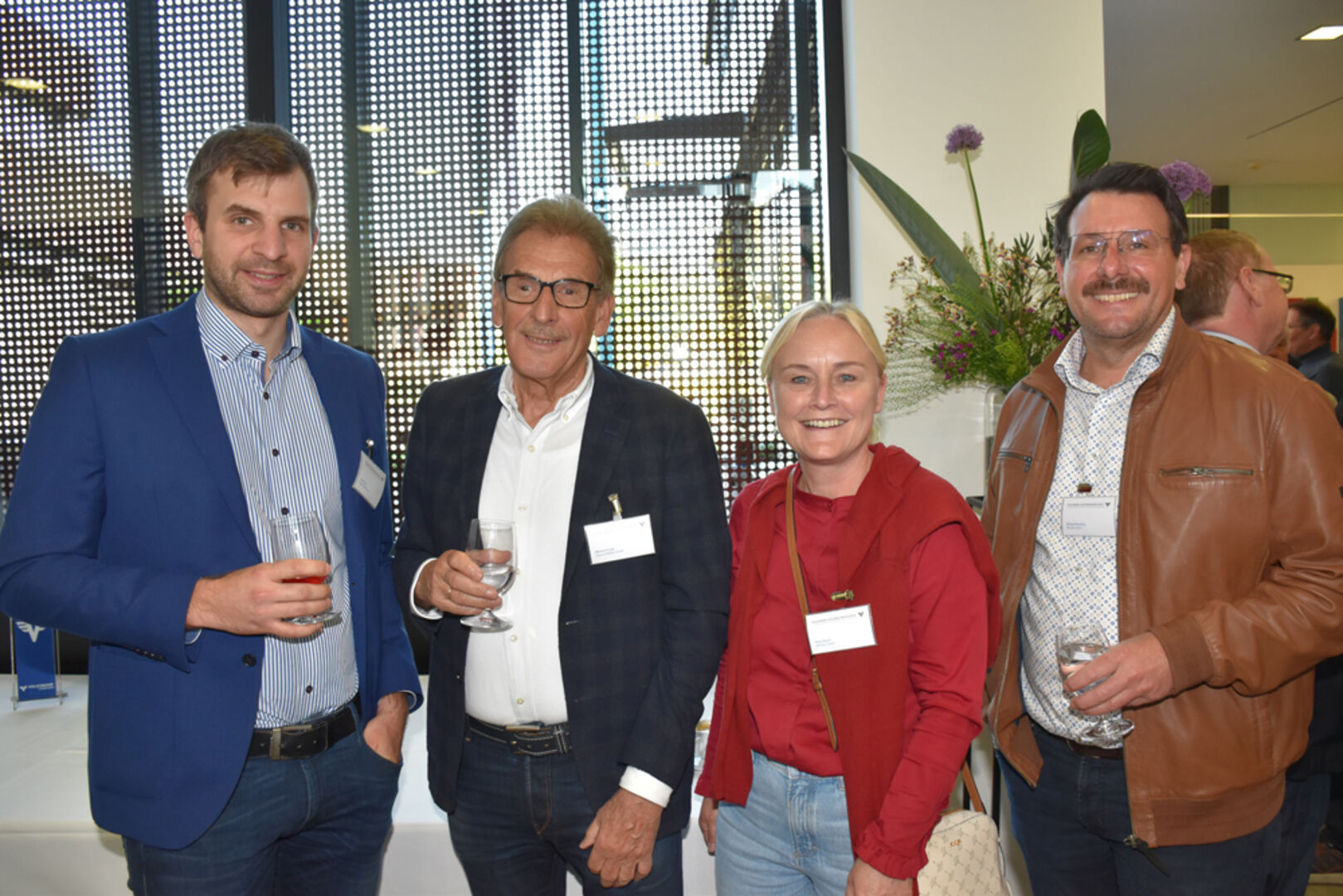 Volksbank-Vorstandsdirektor Helmut Winkler, Unternehmensberater Herbert Loos, Interviewgast Skilegende Franz Klammer, Unternehmerlunch-Moderator Ralf Patrik Gunz und Volksbank-Vorstandvorsitzender Gerhard Hamel.