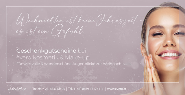 Gutscheine jetzt online anfordern und im Geschäft abholen oder bestellen Sie einen Wertgutschein direkt bei uns: èvero Kosmetik, Treietstraße 23, A-6833 Klaus, Telefon +43 (0)699-17174111