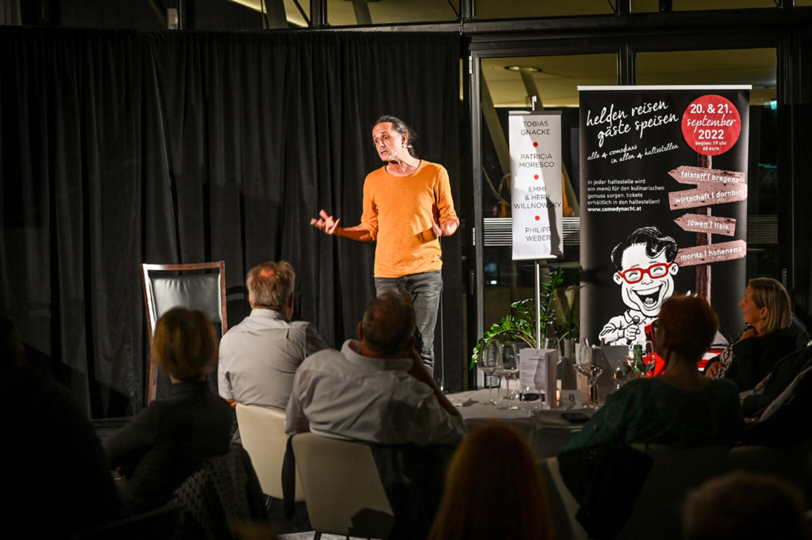 Während Sie sitzen bleiben, reisen die Helden (Künstler) weiter. Mit dabei: Moritz Bio-Restaurant Hohenems, Braugaststätte Löwen Tisis, FALSTAFF Bregenz, Wirtschaft Dornbirn. TOP: Informationen und Reservierungen: www.comedynacht.at