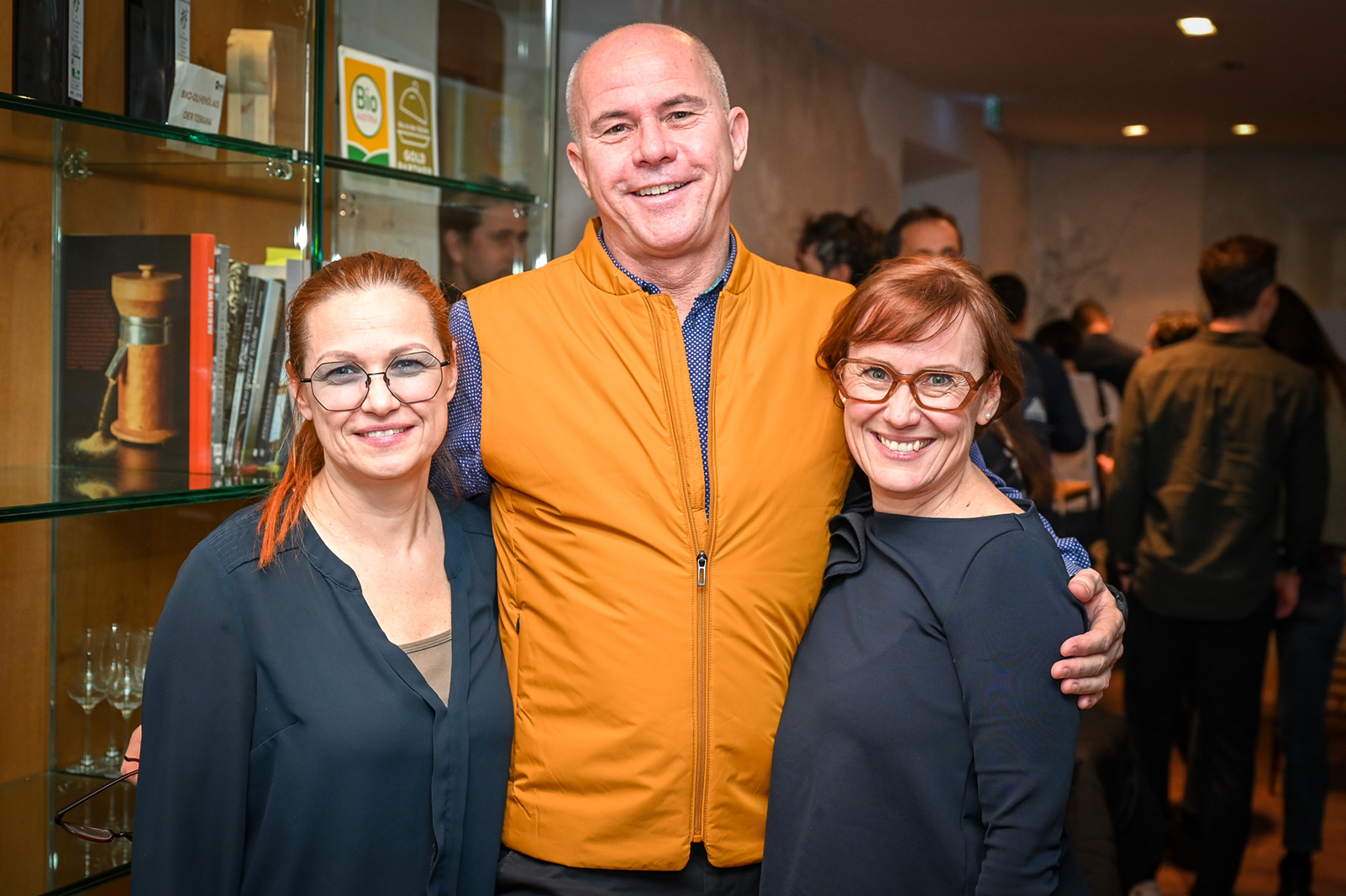 Braugaststätte Löwen Tisis: Nicole Burtscher und Wirt Samuel Hupp (beide Löwen Tisis) mit Künstler Sascha Korf aus Köln (Mitte).