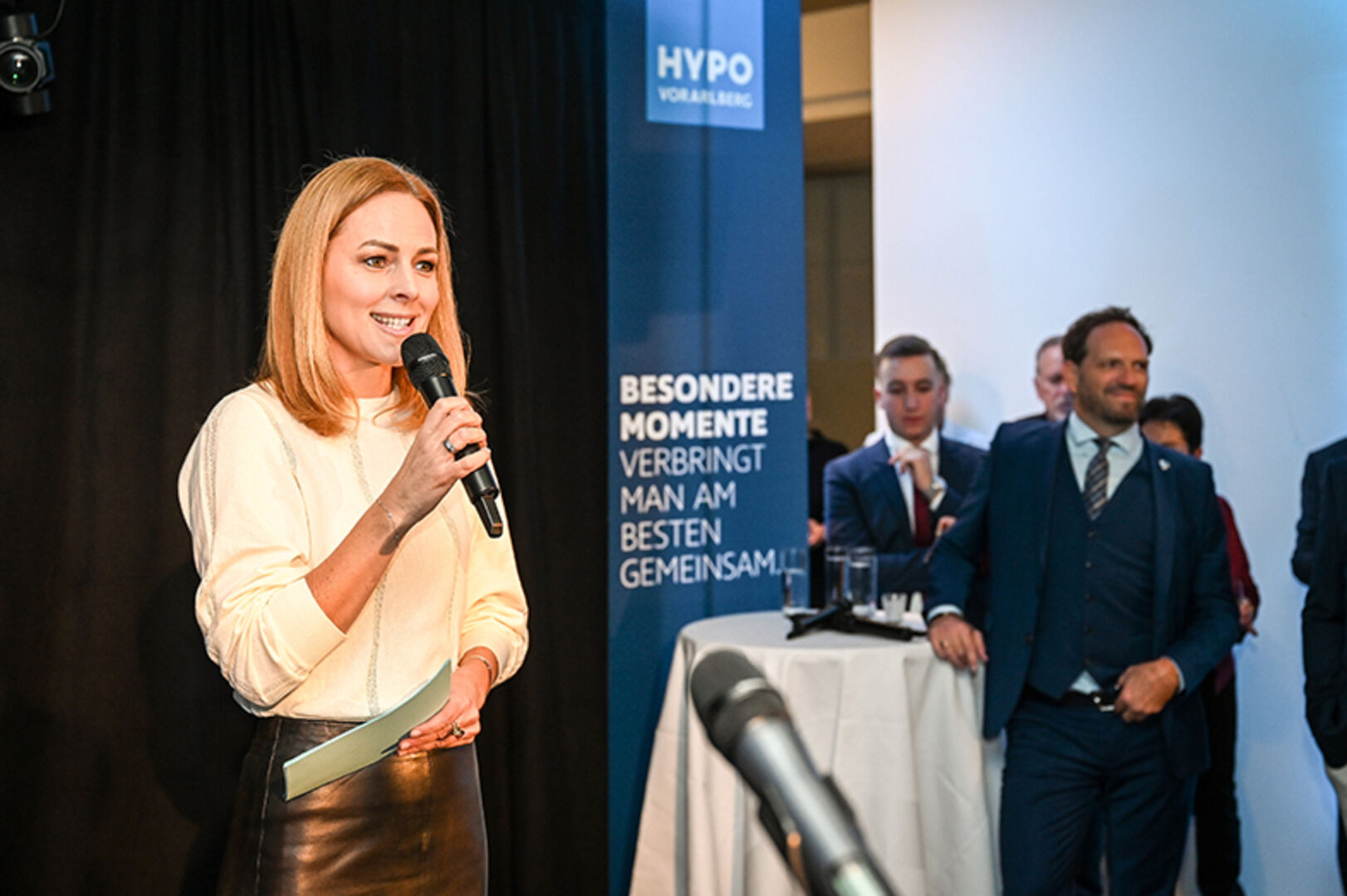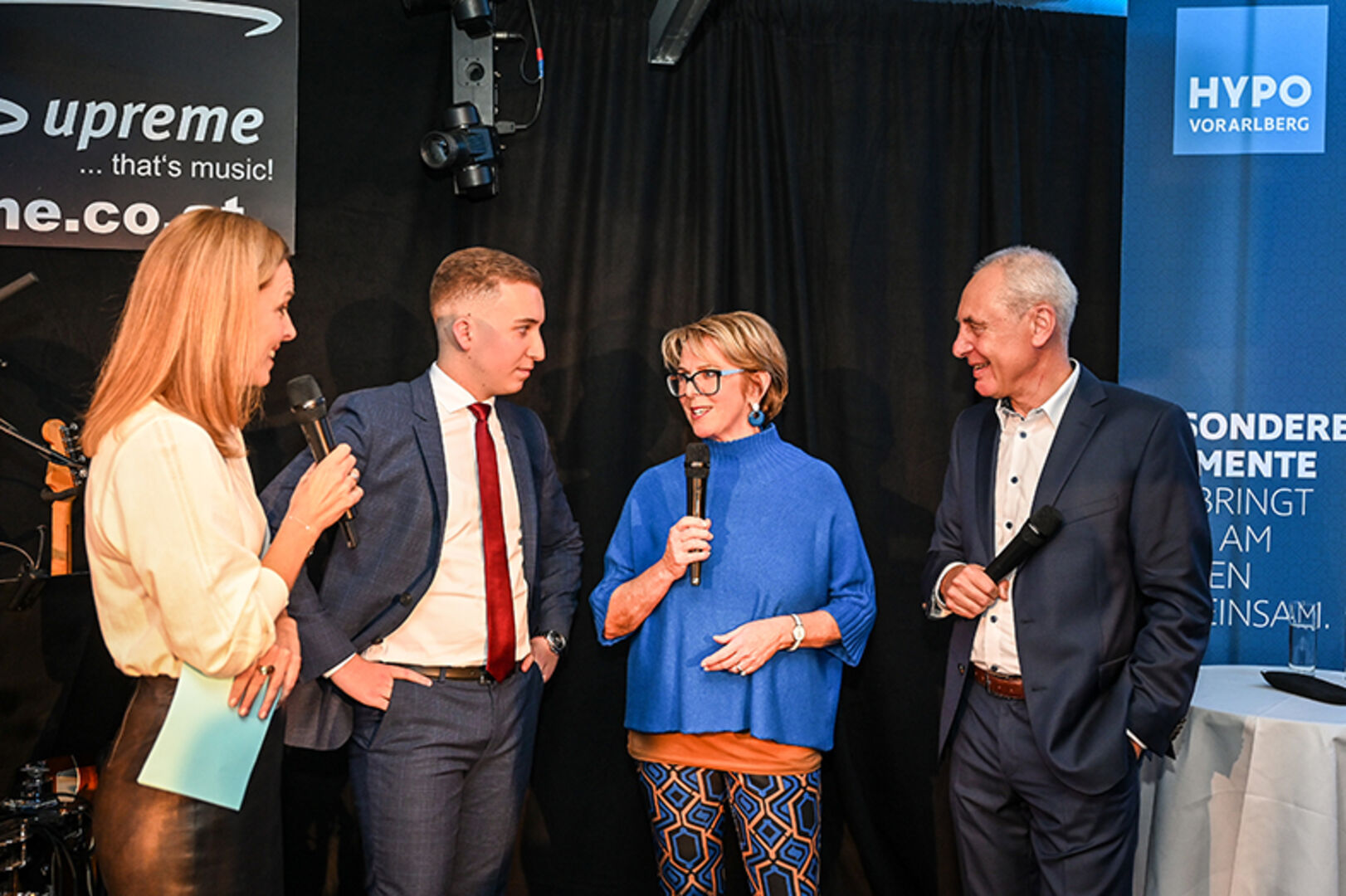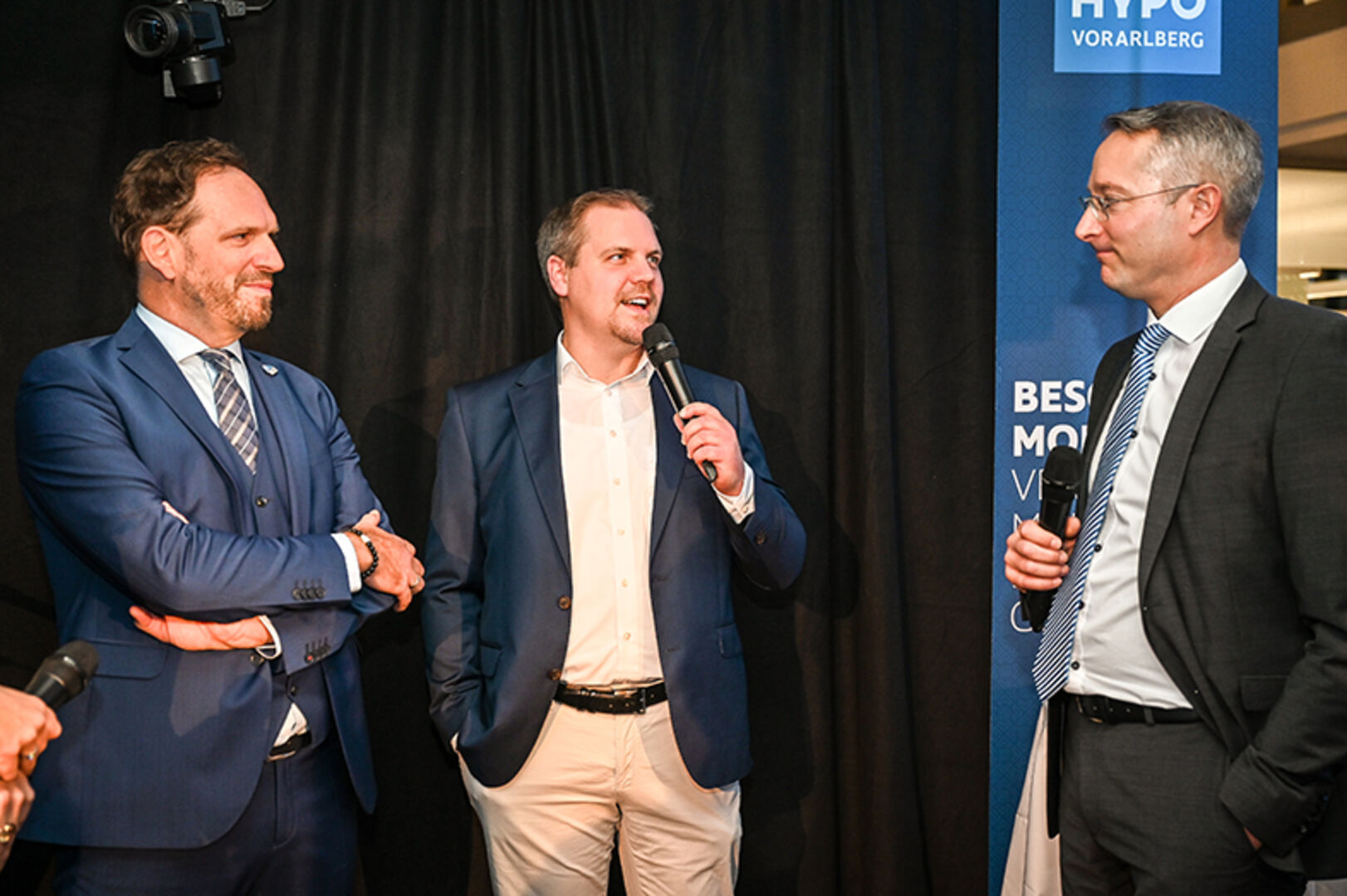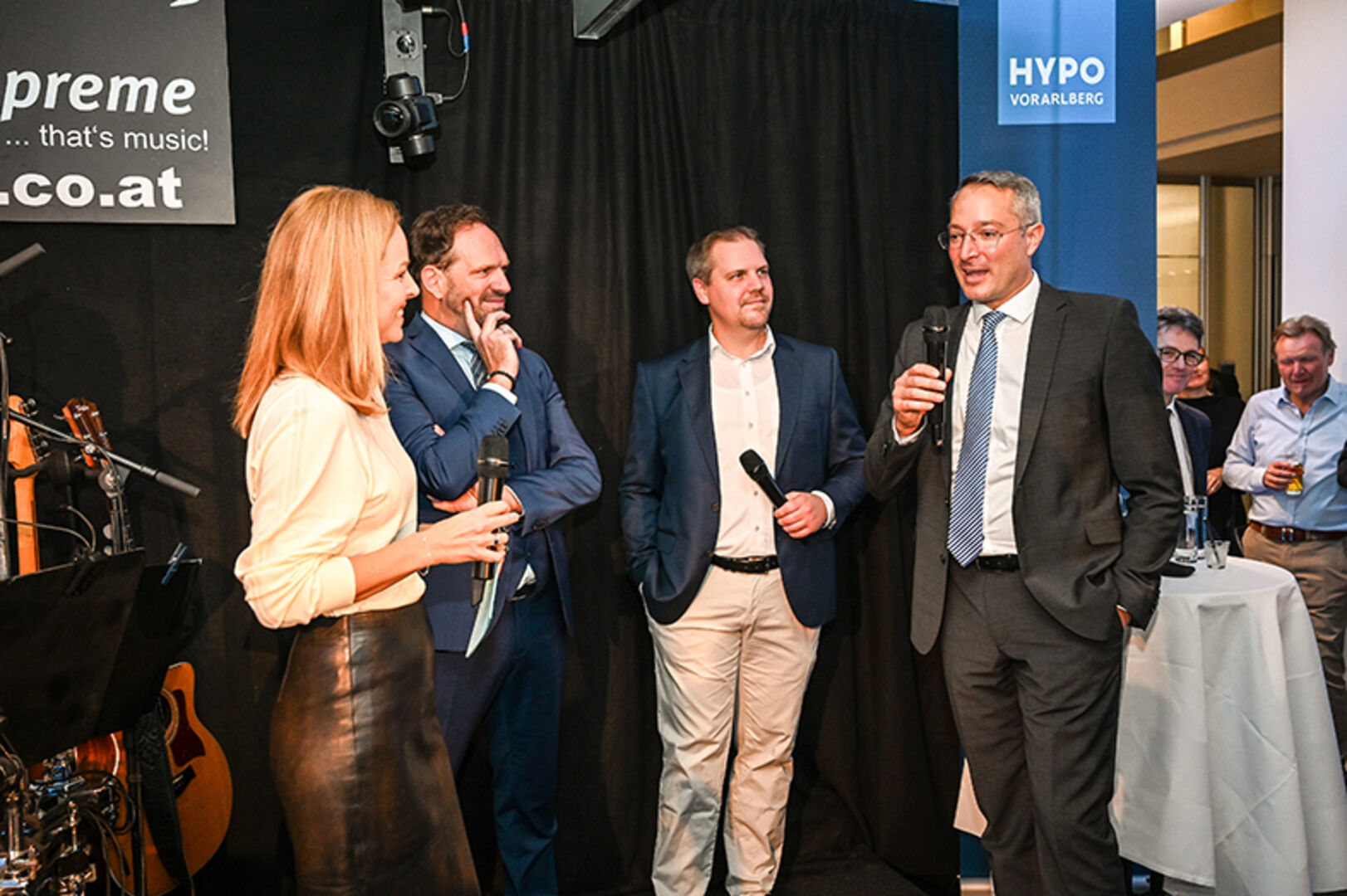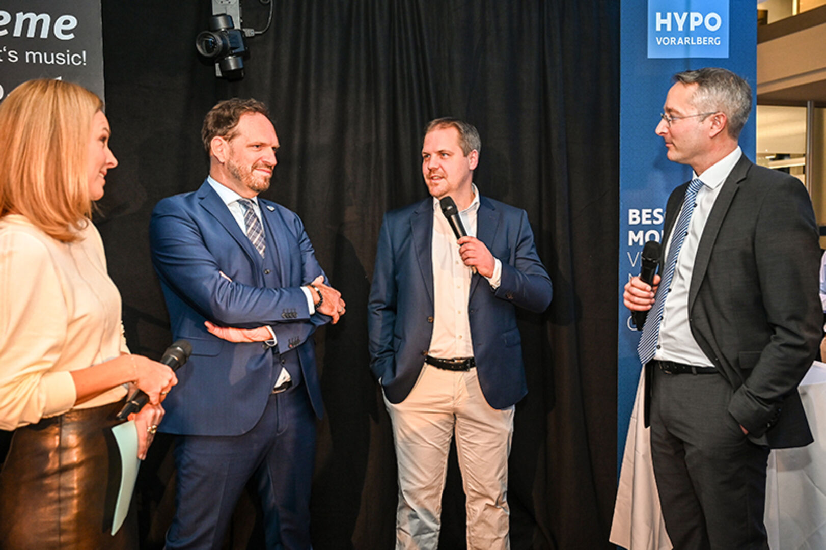 Filialdirektor Graham Fitz (Hypo Lustenau), Moderatorin Kerstin Polzer, Hypo Vorarlberg Vorstand Philipp Hämmerle, Filialleiter Stefan Ritter (Hypo Lustenau) (v. li.)