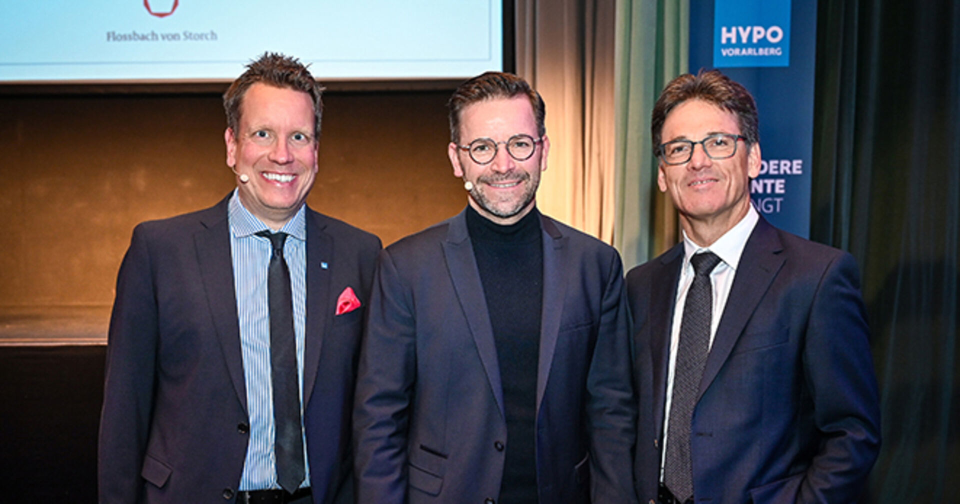 Im Bild oben: Moderator Stephan Bohle (Leiter Private Banking Bregenz, Hypo Vorarlberg) mit Vortragendem Thomas Lehr (Flossbach von Storch, Köln) und Hypo Vorarlberg-Vorstand Wilfried Amann (v. li.)