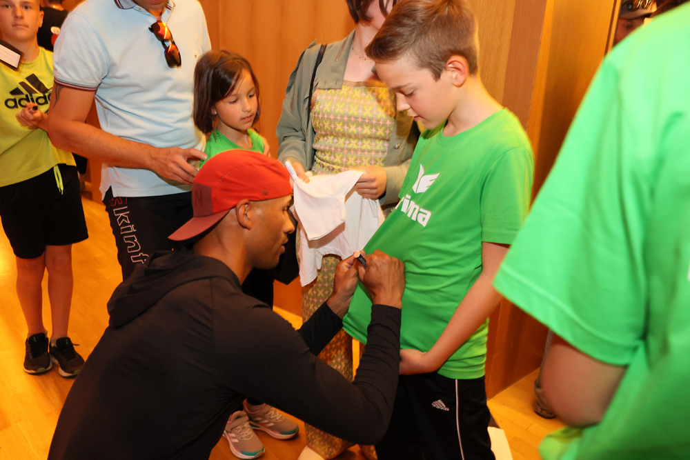 Auch heuer fand wieder der Athletenempfang in der Kulturbühne AMBACH statt. Eingeladen waren alle, die Lust hatten, schon vor dem Meeting die ersten Königinnen und Könige der Leichtathletik hautnah zu erleben. TOP: Nach dem Spalier der Kinder der Sportgemeinschaft Götzis konnten sie die Autogrammkarten und T-Shirts der Hypo Bank von allen anwesenden Stars signieren lassen.