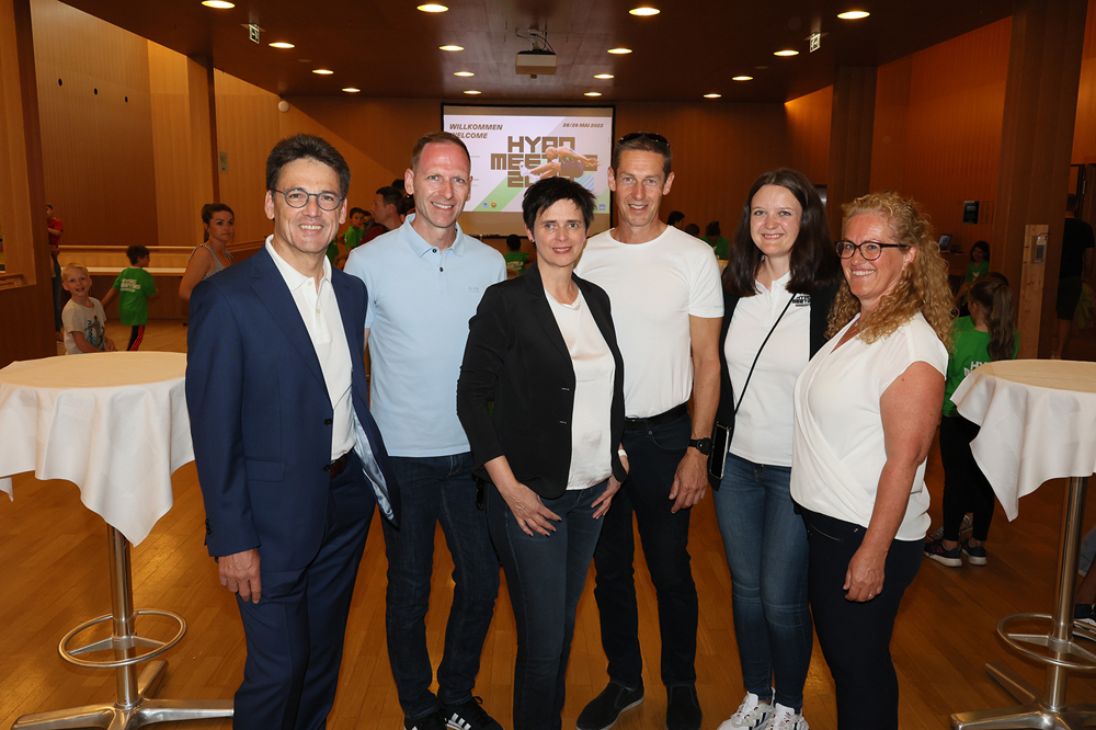 Wilfried Amann (Hypo-Vorstand und Sponsor) mit dem Hypomeeting OK-Team: Michael Riedmann (Sponsoren), Alexandra Gisinger (OK-Präsidentin), Matthias Thurnherr (Physio), Sophie Hotz (Presse) und Michaela Thurnherr (Sportlerempfang) (v. li.)