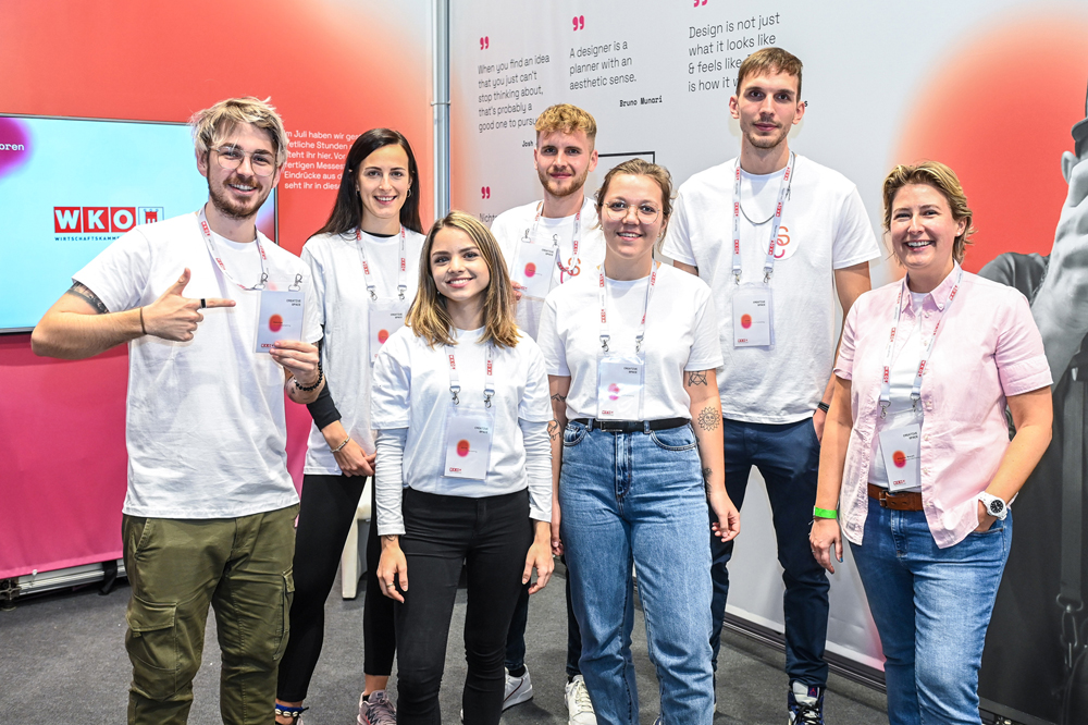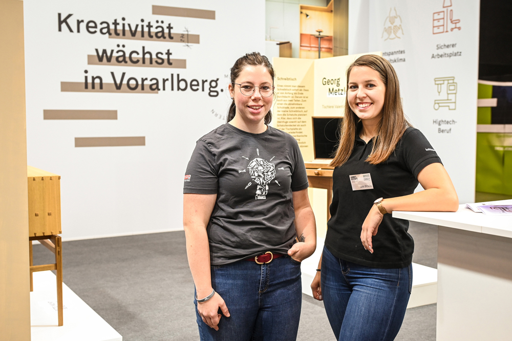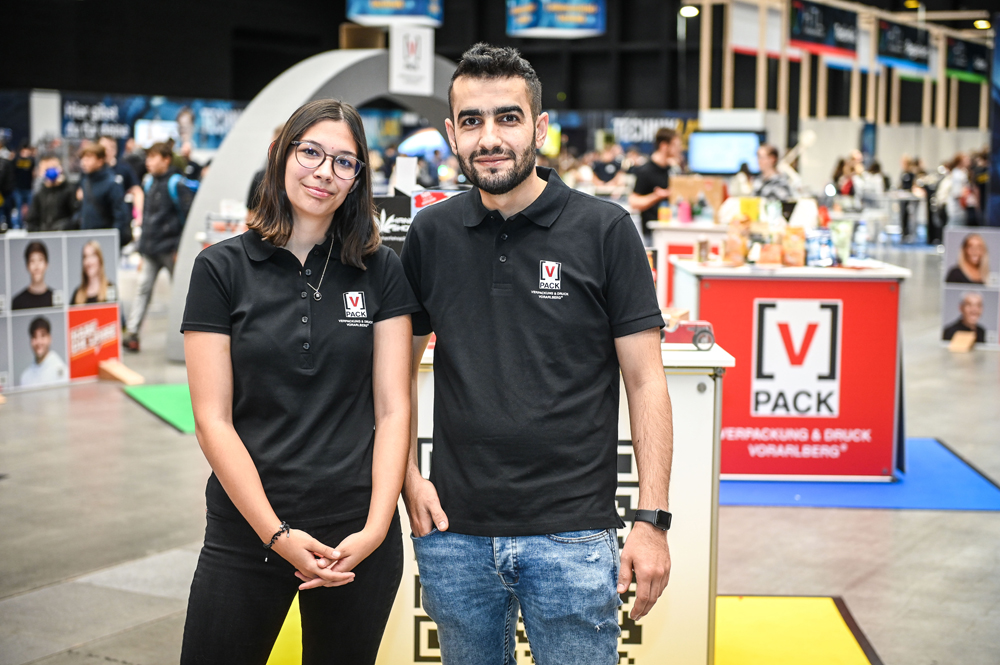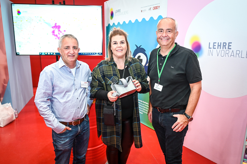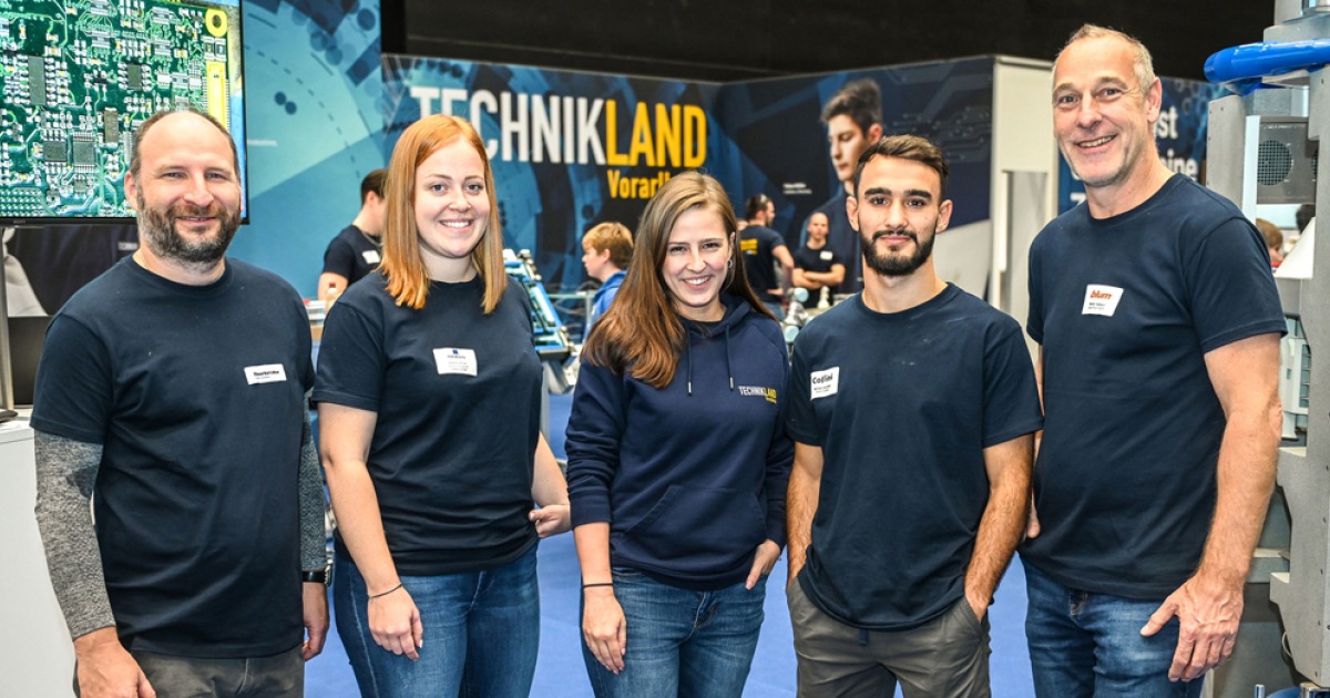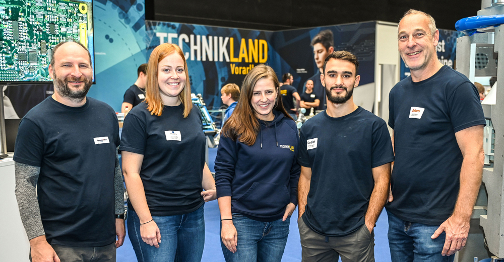 Richard Dürr (Ausbildungsleiter vkw illwerke), Lehrling Corinna Pink (Ausbildnerin Elektrotechnik Heron), Nina Mathis (WKV Projektleitung Technikland), Berkan Demiral (Lehrling Collini), Stefan Gallaun (Ausbildungsleiter Blum Elektro)