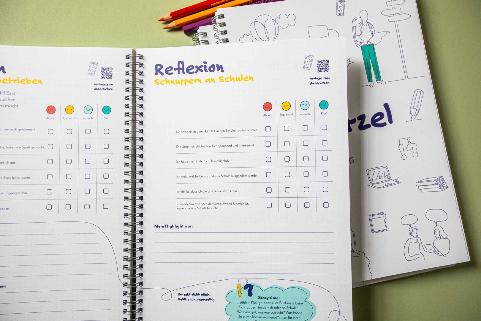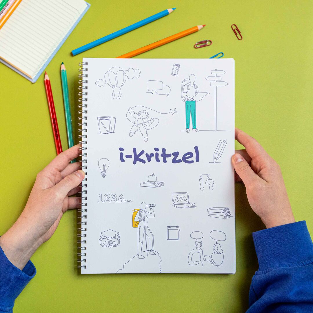 Ein analoges Ringbuch begleitet Schüler:innen der 7. und 8. Klasse bei ihrer Reise durch die Berufsorientierung. Durch die Anbindung an digitale Inhalte ist eine interaktive Nutzung möglich. Ab Schuljahr 2023/2024 wird der „i-Kritzel“ an interessierte Schulen, Eltern und Lehrpersonen verteilt.