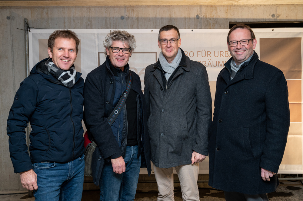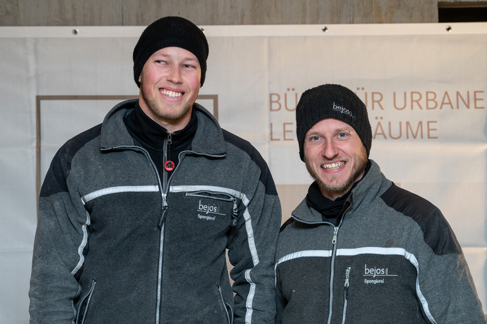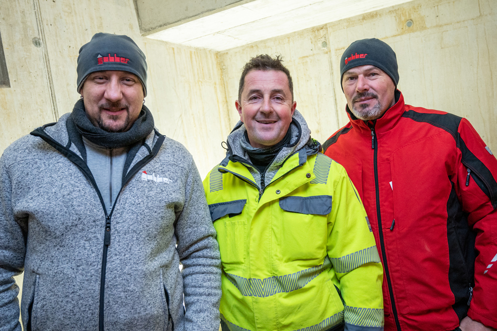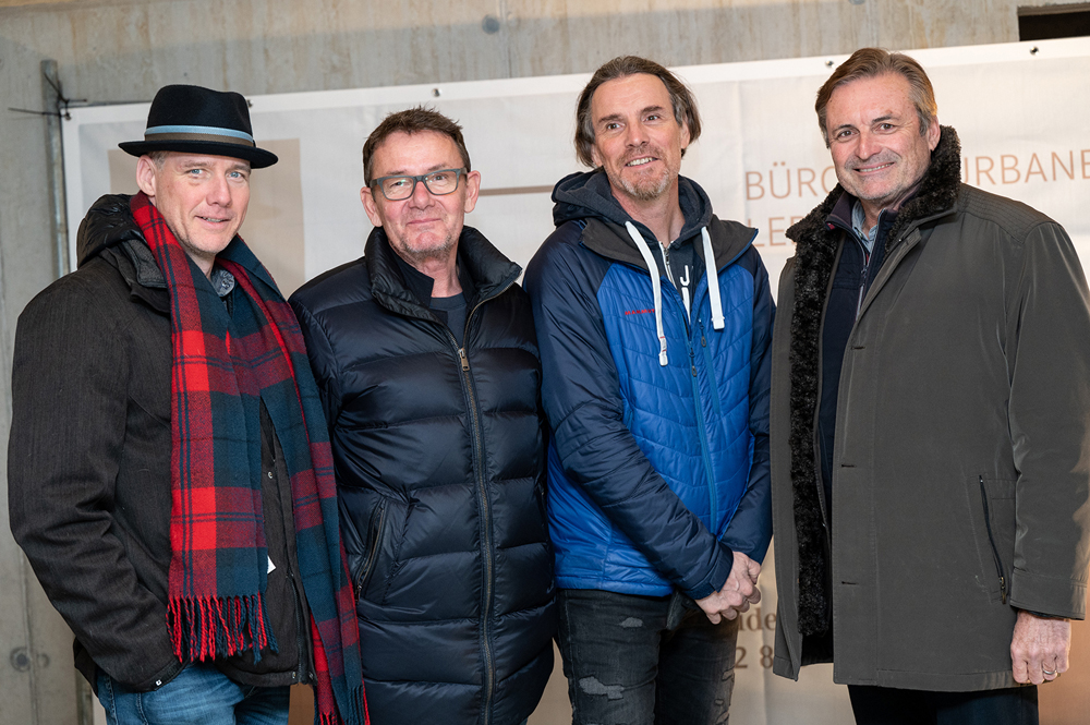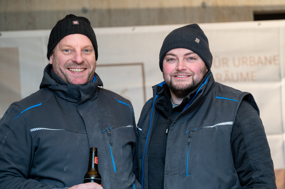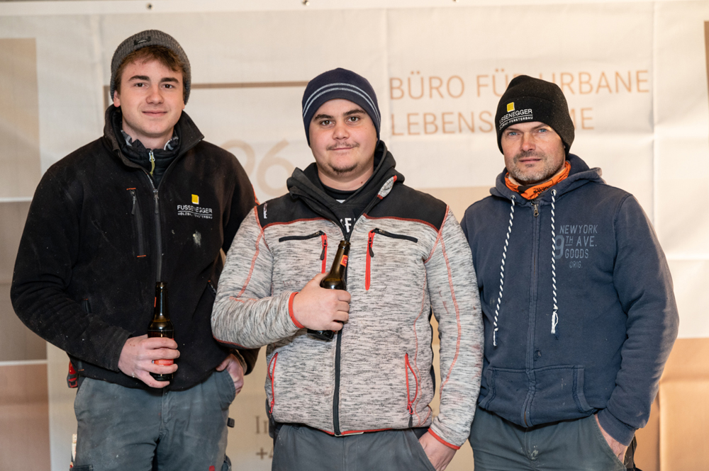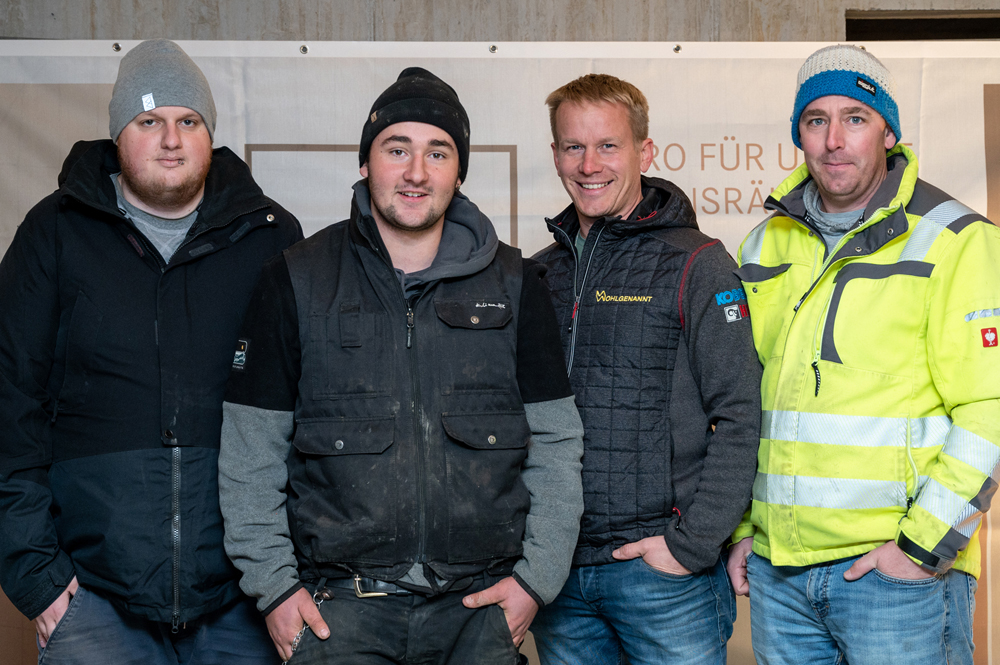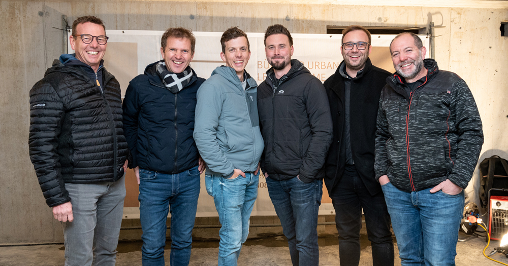 Gute Firstfeier-Stimmung beim INSIDE96 Team: Johann Rauchegger, Geschäftsführer Joe Welte, Matthias Lampl, Michael Amort, Valentin Welte und Matthias Brotzge (v. li.)
