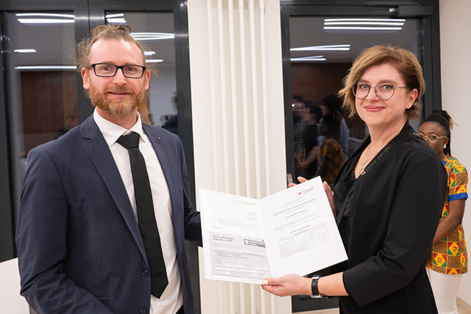 Am vergangenen Donnerstag feierten 14 Absolvent:innen aus neun Nationen den erfolgreichen Abschluss des ersten Nostrifikationskurses für Pflegeassistenz und Pflegefachassistenz an der Pflegeschule Vorarlberg am Lernort Bregenz. Nikolaus Blatter, PhD vom Amt der Vorarlberger Landesregierung und DGKP Sandra Blaha, BA, Leitung Lernort Bregenz, freuten sich, die Ausbildungsbestätigungen überreichen zu dürfen.