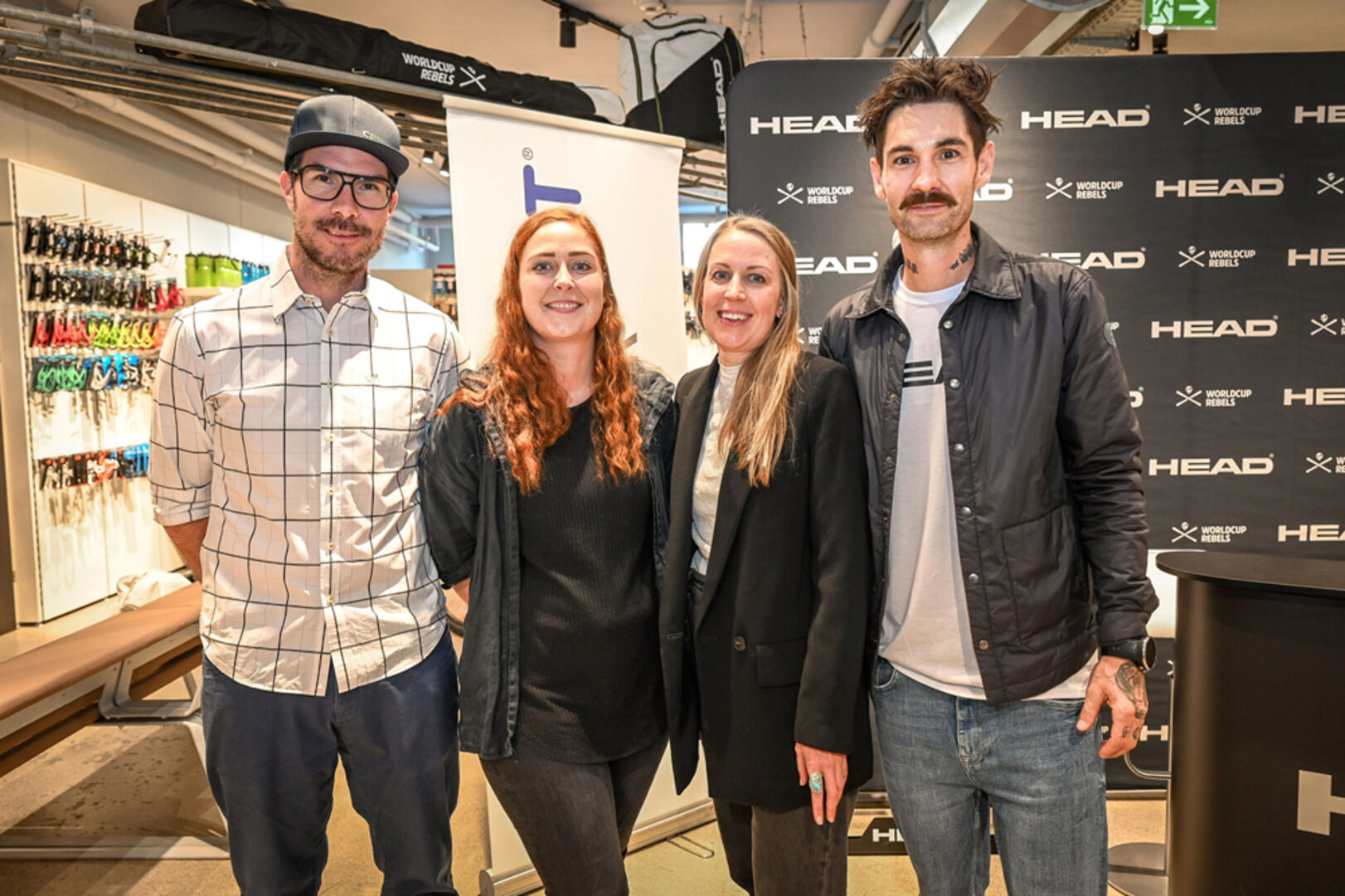 Intersport Fischer Gastgeber Michael und Mario Fischer mit Doppel-Olympiasieger Johannes Strolz, Intersport Fischer Dornbirn Geschäftsführer Daniel…