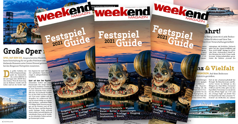 Der neue FestspielGuide 2021 erscheint perfekt zum 75-jährigen Jubiläum. Der 100-seitige Kultur-Führer beinhaltet Termine und Infos über Veranstaltungen und Aktionen der Bregenzer Festpiele, der Kultureinrichtungen der Stadt Bregenz, aber auch Tipps, Infos & Events aus dem Ländle und dem grenznahen Raum. Ausstellungen in Liechtenstein, Schweiz und Süddeutschland ergänzen den umfangreichen Führer, der auch gastronomische Highlights und Freizeitmöglichkeiten im Ländle und am Bodensee präsentiert.