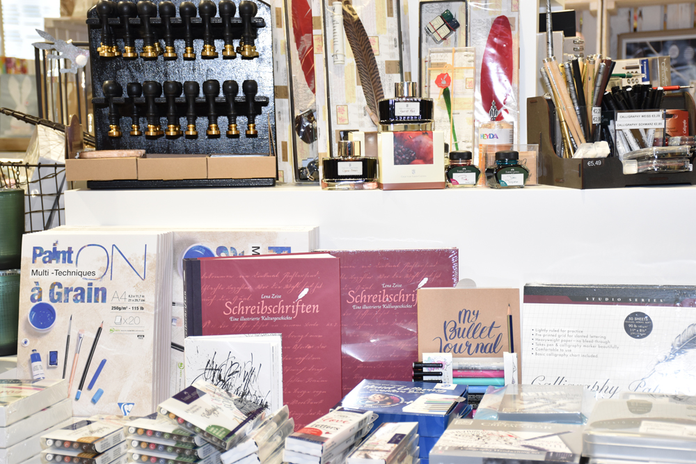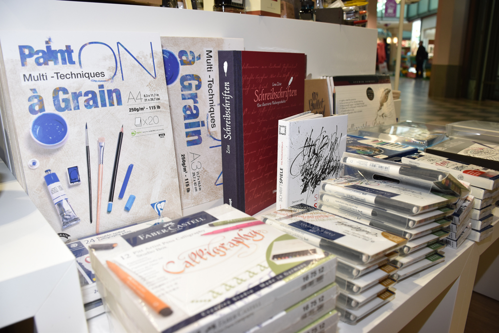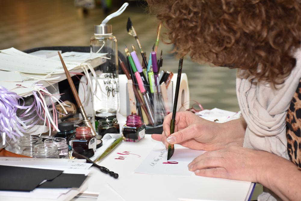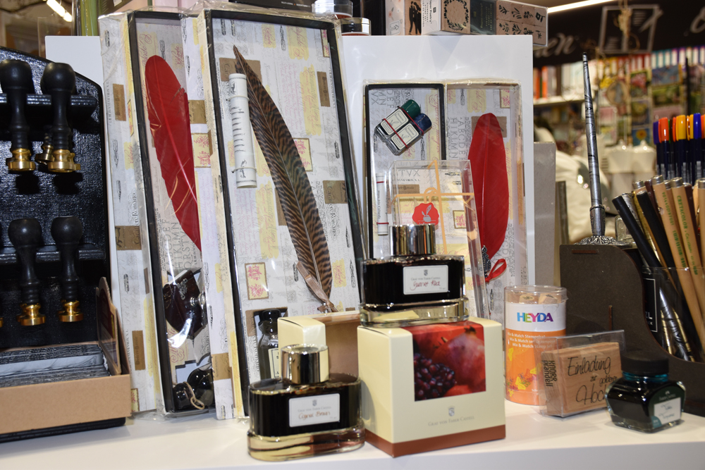 Karten, Albumgestaltung, Werbung, aber auch Briefen eine persönliche Note zu geben, Inspiration und neue Ideen gab es in Hülle und Fülle. Vor allem die Auswahl an Produkten rund um`s Schreiben überraschte die Kunden. Hier wurde alles für Künstler, Zeichner präsentiert, was erforderlich ist. Vom Kalligraphie-Papier über Federn, Pinsel und Tinte wurde von verschiedenen Marken Material und Zübehör rund um die Kalligrafie und Schriftkunst präsentiert. Die Paterno-Papeterie im Messepark ist die erste Adresse mit Marken wie Artoz, Städtler, Pentel, Tombow, Faber Castell , Creta Colour, Eberhard Faber uvm.