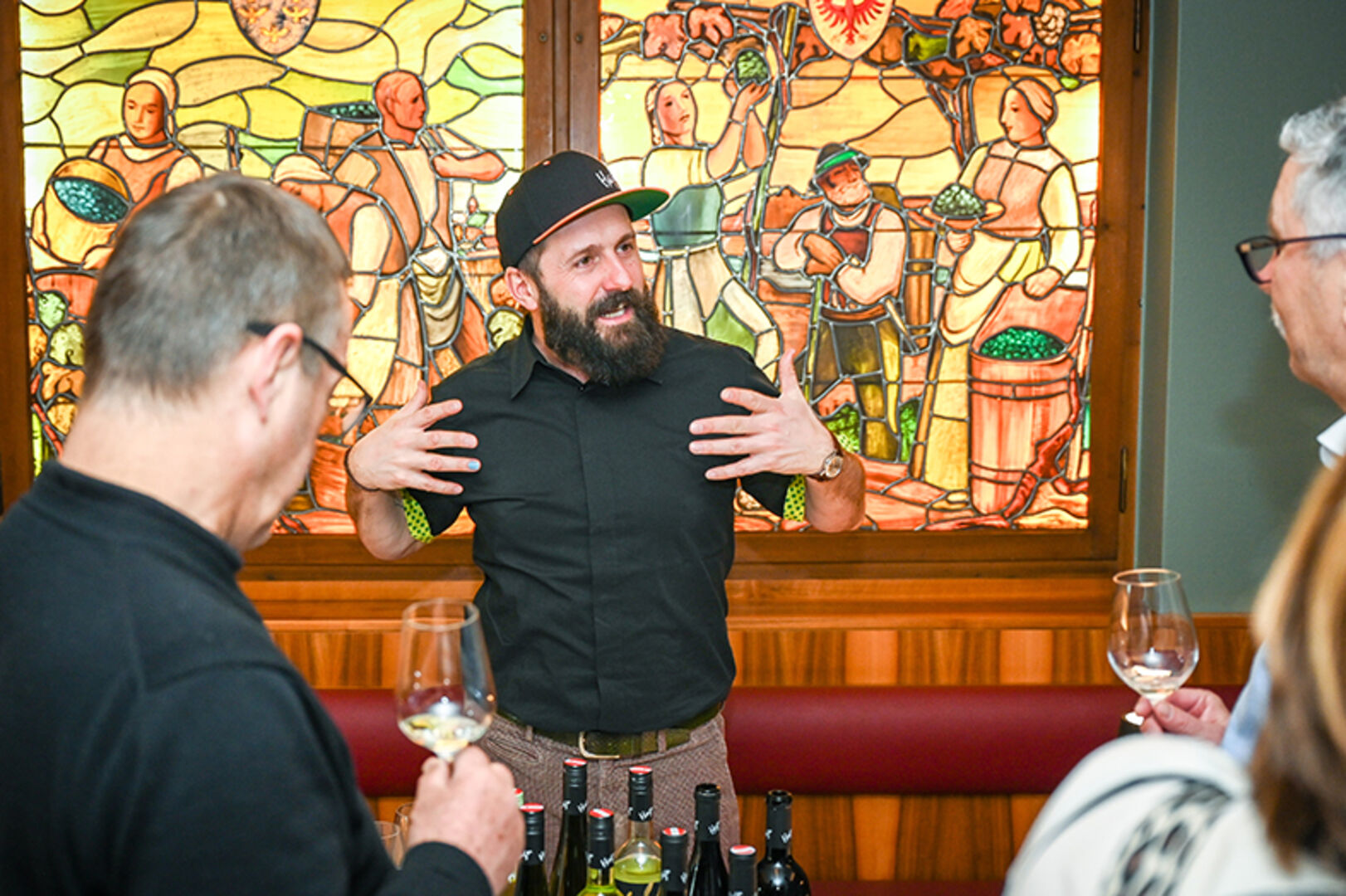 Kornmesser Wirtepaar und Gastgeber Thomas und Theresia Zwerger mit österreichischen Winzern aus acht verschiedenen Weingütern beim Winzertreff.