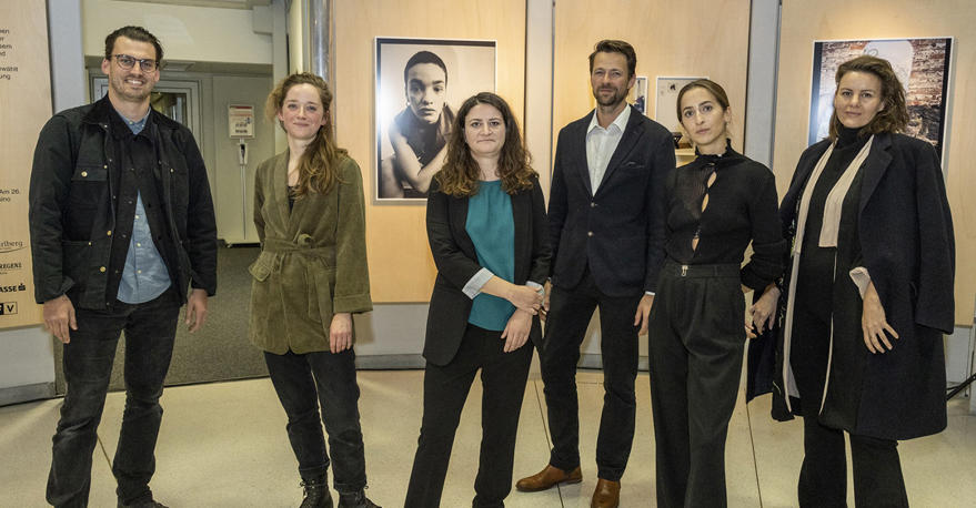 Die nominierten Fotografen: Florian Gerer, Ronja Svaneborg, Janine Maria Schneider, Lukas Birk, Maria Ritsch (ritsch sisters) und Eva Kees (v. li.)