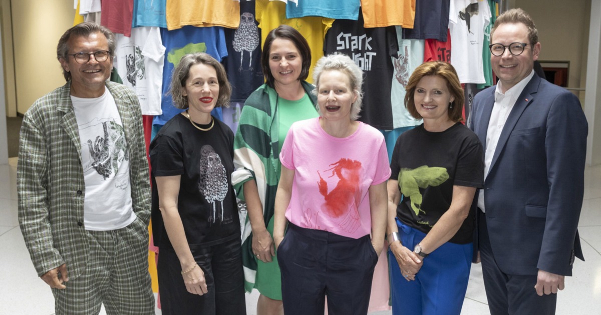 Thomas Häusle (li., Kunstraum Dornbirn) und Winfried Nußbaummüller (Kulturabteilung Land Vorarlberg) bewunderten die rund 400 bedruckten T-Shirts.