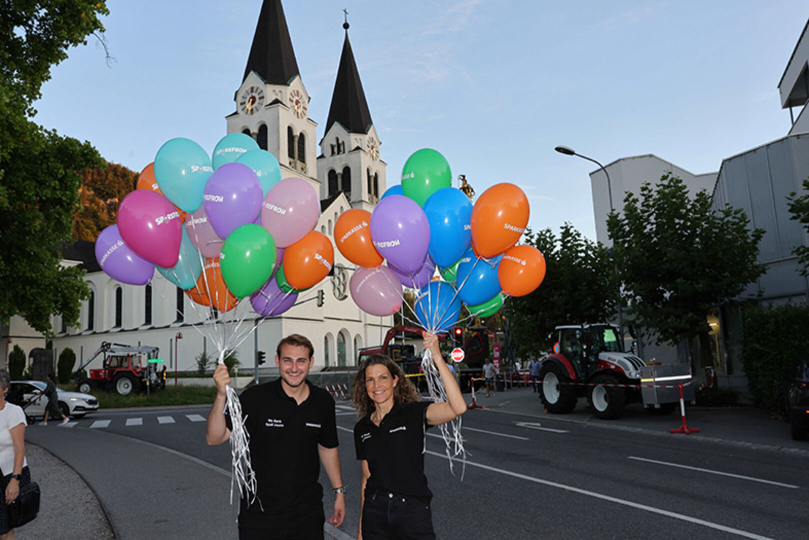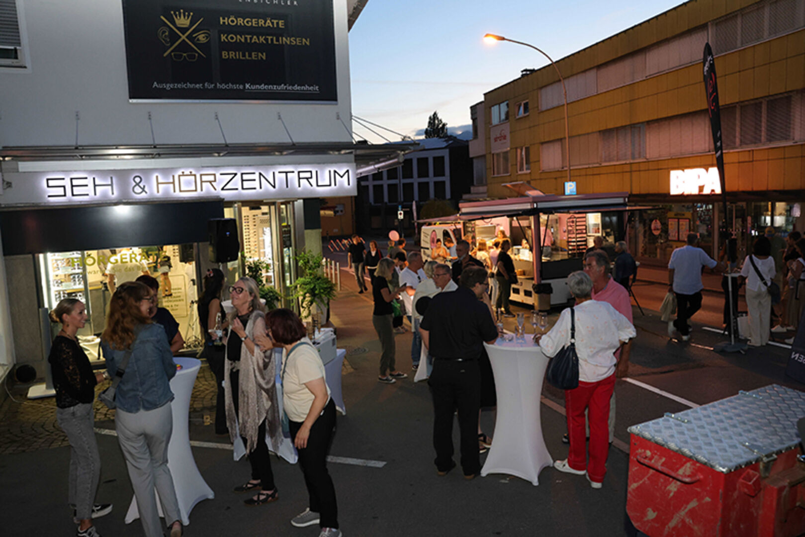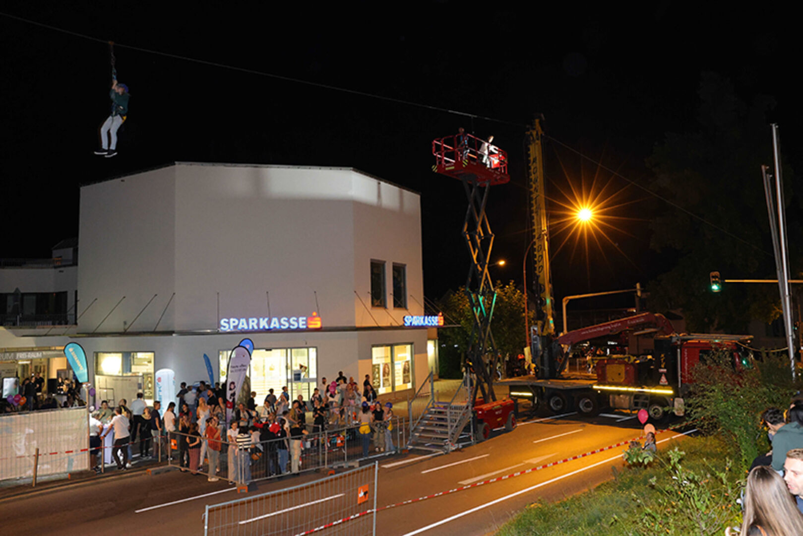 Beste Stimmung bei sommerlicher Atmosphäre bei der Shopping-Night, die tausende Gäste nach Götzis lockte. TOP: Der Flying Fox, bei dem die Hauptstraße in 12 Meter Höhe überflogen wurde.