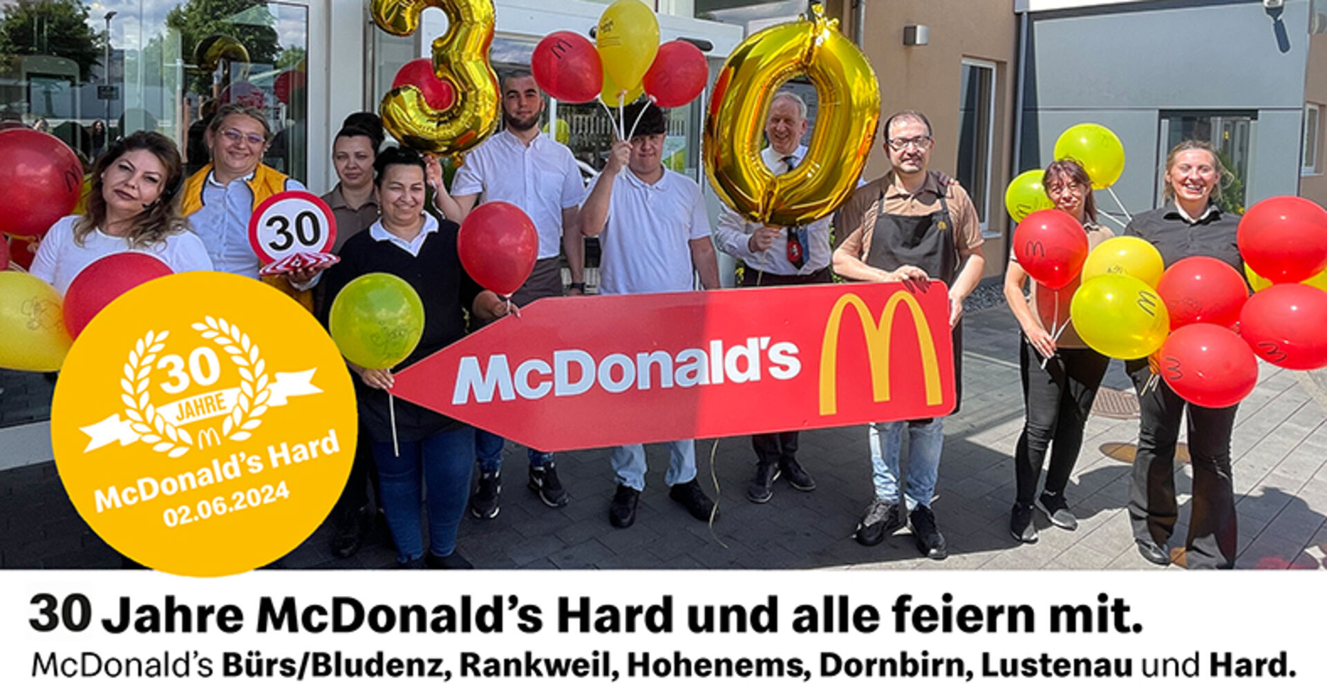 Am 24. März 1994 öffnete das McDonald’s Restaurant in Hard erstmals seine Türen – 30 Jahre später ist der Standort mit 60 Mitarbeiter:innen aus 17 Nationen nicht nur ein wichtiger lokaler Arbeitgeber, sondern trägt mit rund 70 Prozent Lebensmitteln aus Österreich auch zur regionalen Wertschöpfung bei. Maßgeblich für die erfolgreiche Entwicklung der letzten drei Jahrzehnte war neben der familiären Atmosphäre auch der Ausbau der Servicekultur: mit digitalen Bestellterminals, Tischservice, Gästebetreuung und Bestellungen über die McDonald’s App.