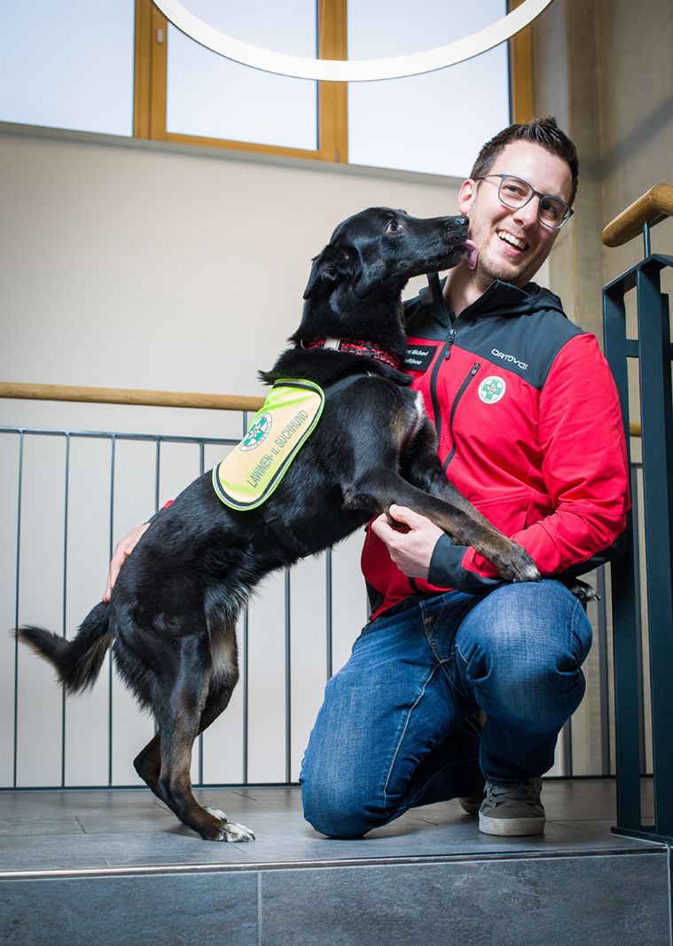 Michael Erhard: Wir wollten zunächst nur einen Familienhund und holten uns einen Mischling vom Bauernhof. Im Zuge meiner Bergrettungsausbildung kam ich mit der Hundestaffel in Kontakt. Shadow wurde auf Tauglichkeit überprüft und so begann ihre Ausbildung zum Rettungshund. Das ist eigentlich nicht der übliche Weg. Im Normalfall kommt man ohne Hund zur Hundestaffel und dort wird man beraten welche Rassen sich eignen. Shadow wird jährlich rezertifiziert und war bei mehreren Rettungsaktionen im Einsatz – u. a. bei Lawinenereignissen und zuletzt beim SARUV Einsatz in der Türkei.