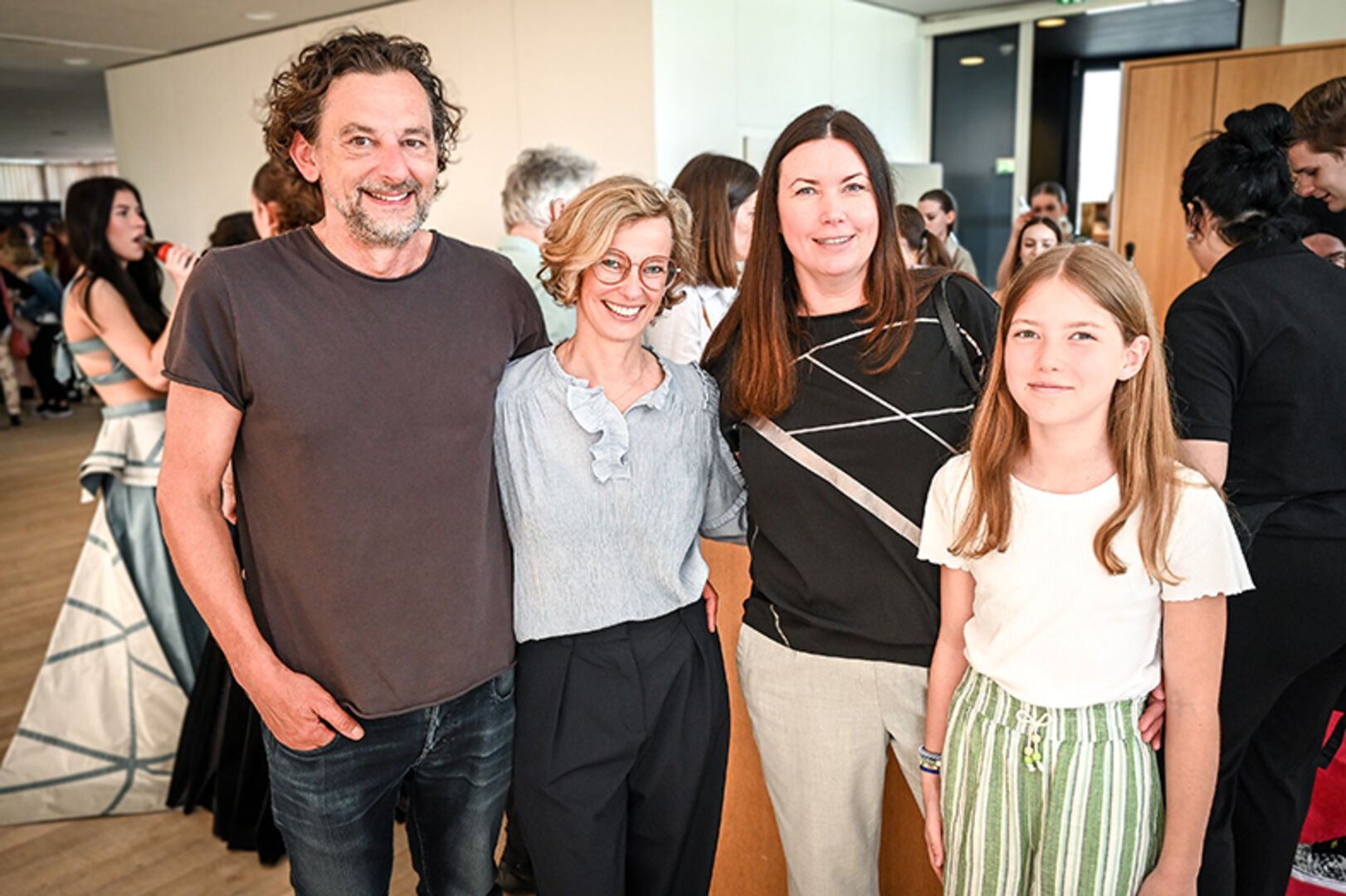 Hausherr Udo Reiner (Raiba) und Stadtrat Alexander Juen mit Nachwuchs-Model Jemima Klein (v. li.)