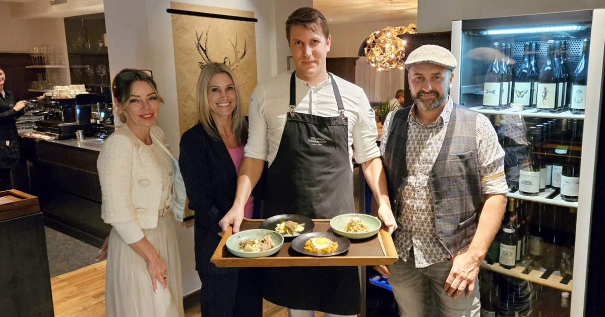 Ilonka Benninghoven (li.), Monika und Jochen Kessler (VWK) mit Hörnlingen-Inhaber und Chefkoch Dominic Mayer (Mitte)