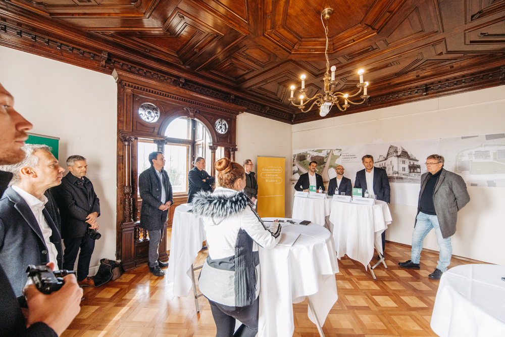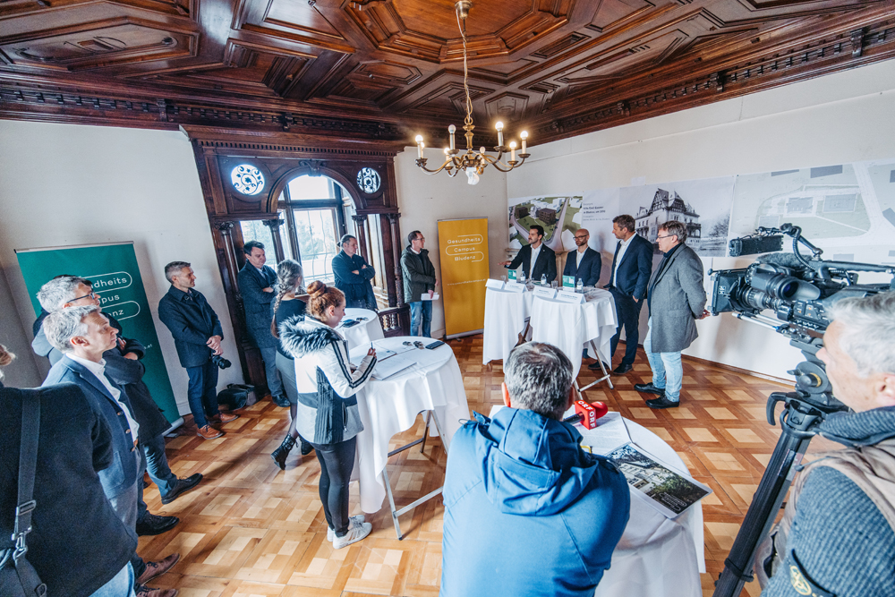 Die Projektverantwortlichen stellten den Gesundheitscampus am 1. Dezember 2022 im Rahmen einer Pressekonferenz der Öffentlichkeit vor: Simon Tschann, Bürgermeister Bludenz, Dr. Daniel Gfrerer, Facharzt für Innere Medizin und Kardiologie, Markus Comploj, CEO von Getzner, Mutter und Cie., Markus Mitiska, mitiska wäger architekten zt oeg (v. li.)