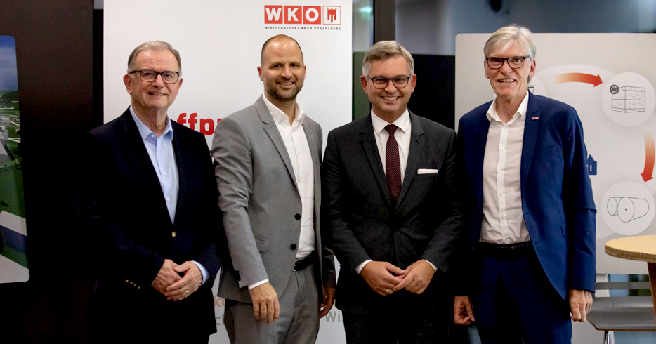 WKÖ-Generalsekretär NR Karlheinz Kopf, Landesrat Marco Tittler, Finanzminister Magnus Brunner und WKV-Präsident Wilfried Hopfner (v. li.)