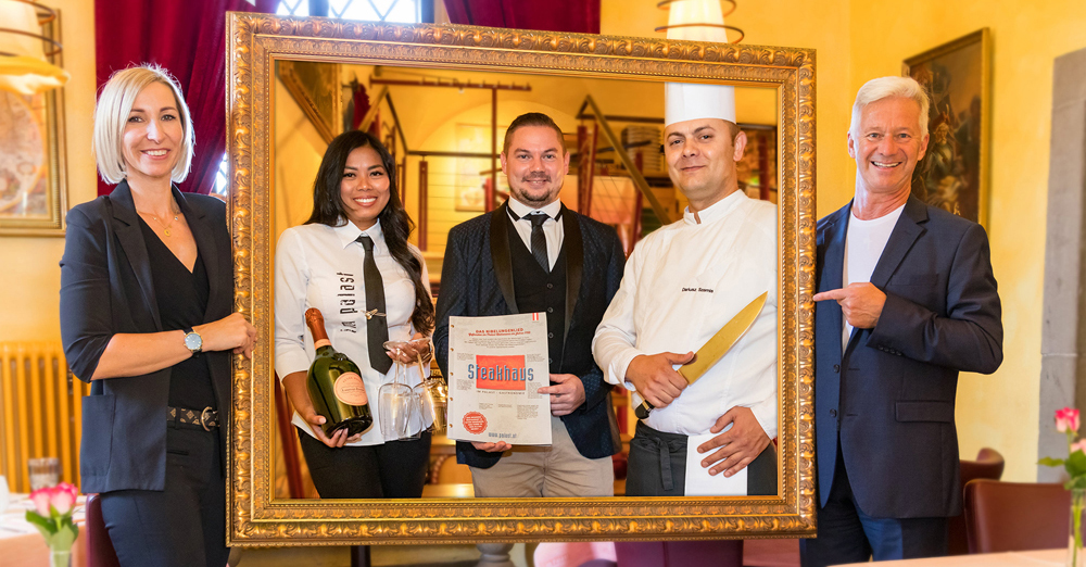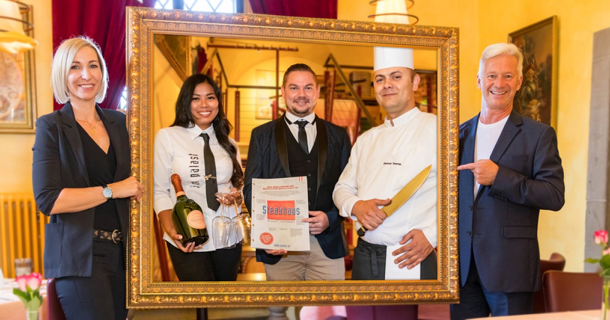 Die neuen Palast Gesellschafter: Anina Ocampo (Serviceleitung) Phillip Jabornig (operative GL) Dariusz Szemis (Küchenchef) und Übergeber/Hauptgesellschafter…