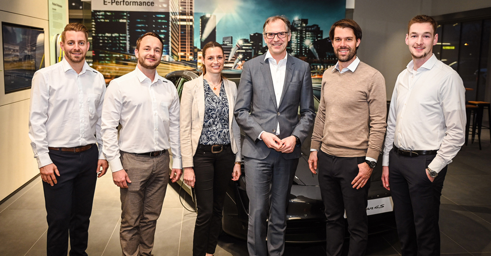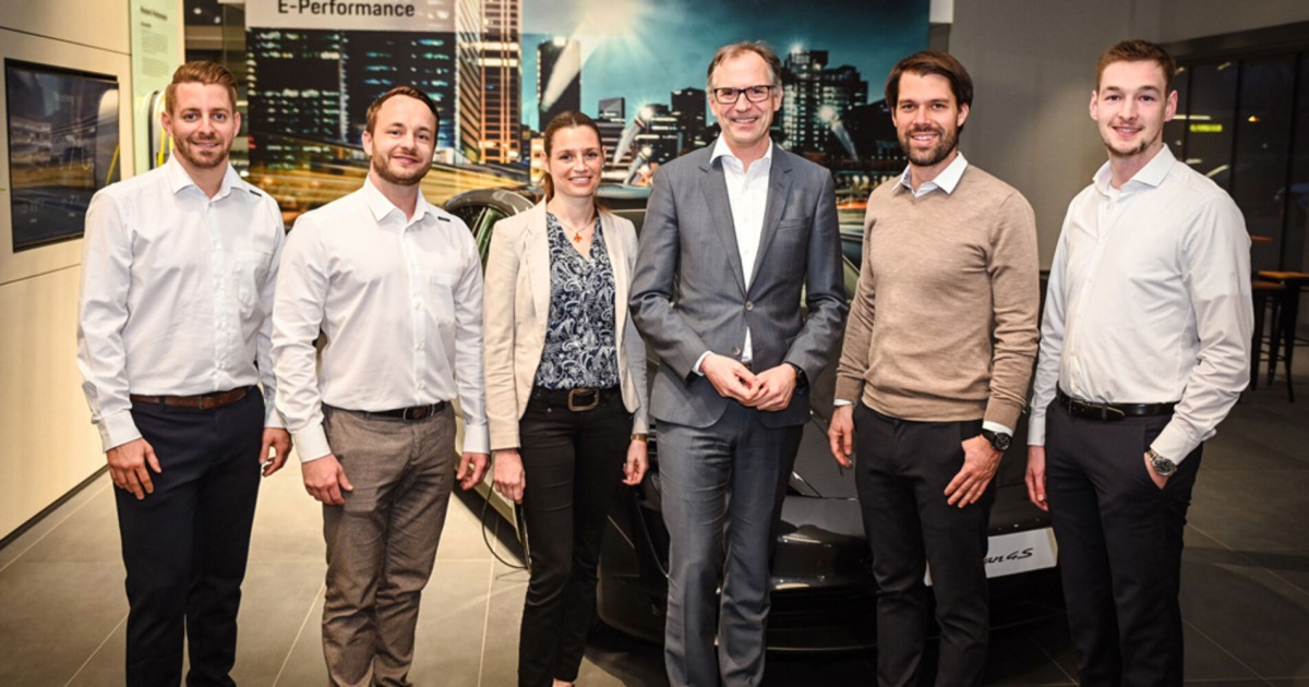 Vom Porsche Zentrum Vorarlberg Kevin Senekowitsch (Verkauf), Domink Fröhle (Markenleiter), Viktoria Würfel (Marketing), Rudi Lins (Geschäftsführung) sowie vom Porsche Service Zentrum Dornbirn Geschäftsführer Hannes Wölfl und Julian Baumgartner (Verkauf) (v. li.)