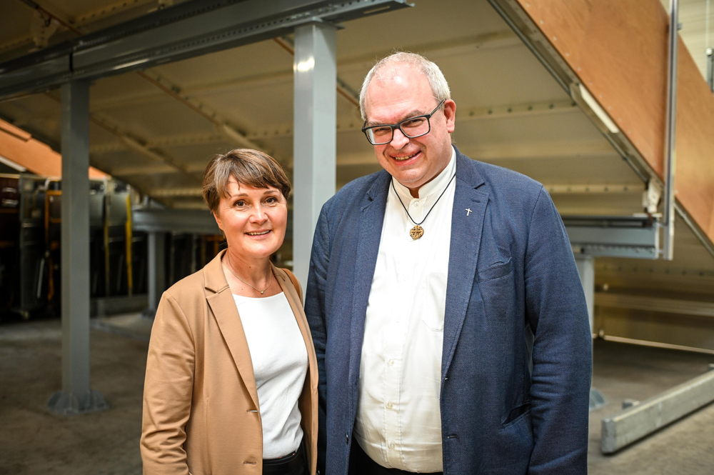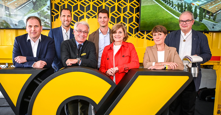 Einweihung des 27 Mio. Euro-Projekts der Post: Tobias Nußbaumer (Produktionsleiter Logistikzentrum Vbg), Franz Leitner (Ltg. Transportlogistik), Georg Pölzl (Generaldirektor der Österr. Post AG), Manuel Salzl (Projektmanagement Infrastruktur), Landesstatthalterin Barbara Schöbi-Fink, Angelika Moosbrugger (Vizebürgermeisterin Wolfurt) und Generalvikar Hubert Lenz (Diözese Feldkirch)
