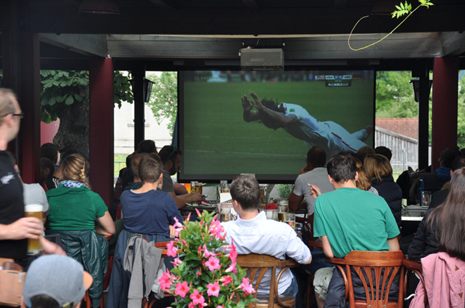 Damit wirklich jedes Spiel vom Anpfiff bis zum Schlusspfiff mitverfolgt werden kann, wurde ordentlich aufgerüstet. So gibt es neben dem bestehenden Full-HD-Beamer unterm Pavillon und dem 65 Zoll-TV direkt bei der Außenschank ab jetzt einen zweiten, leistungsstarken Beamer im Bereich der neuen Teilüberdachung. Die EM Speise- und Getränkekarte informiert über Gaumenfreuden, während Länderfahnen passende, optische Akzente setzen.