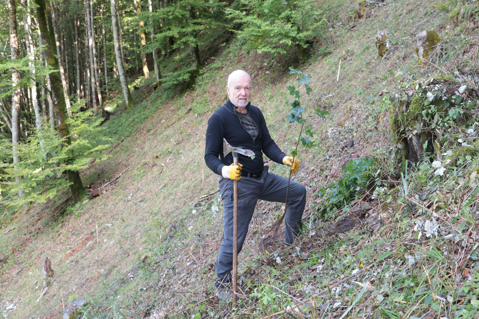Förster Elmar Nöckl und Mitarbeiter wie Martin Weiß hatten den kargen, vom Eschentriebsterben betroffenen Boden im „Unteren Kreuzeck“ vorbereitet. TOP: Die Vielfalt der gepflanzten Bäumchen – Ahorn, Buche, Eberesche, Fichte, Linde und Weißtanne.