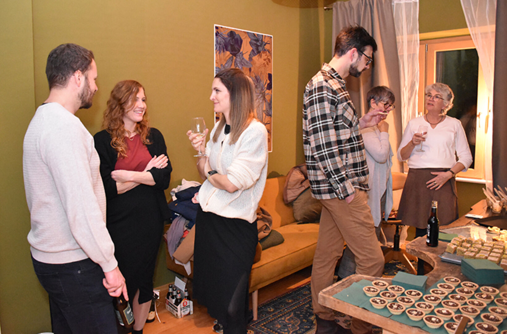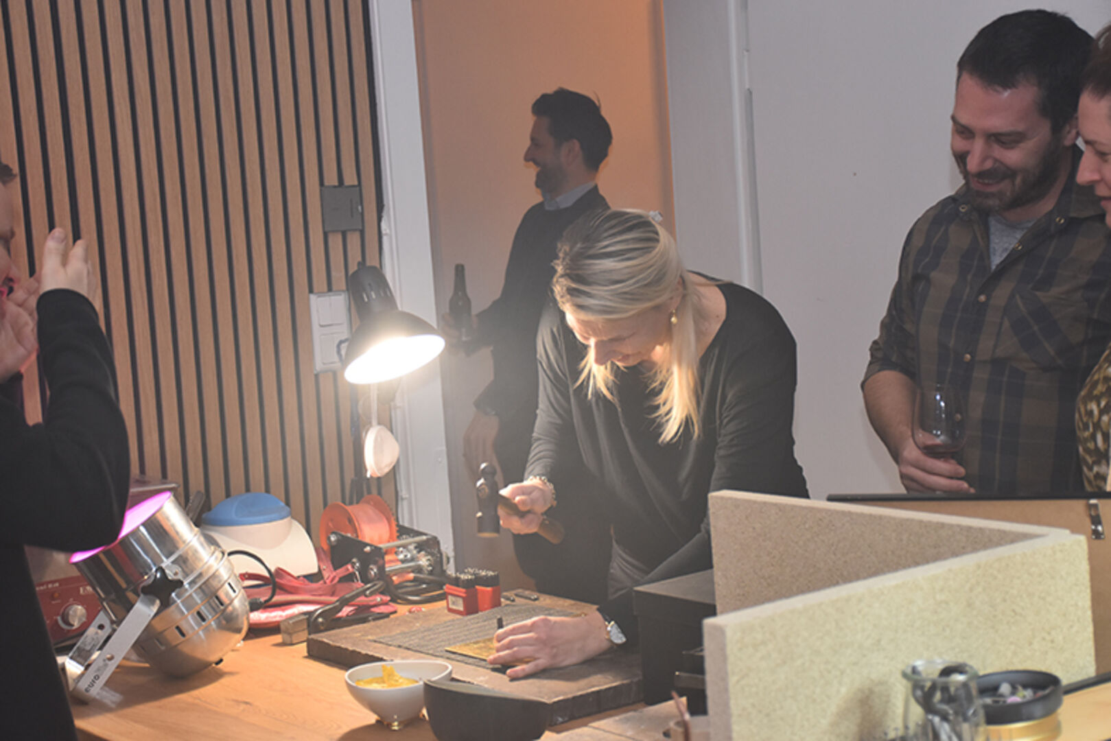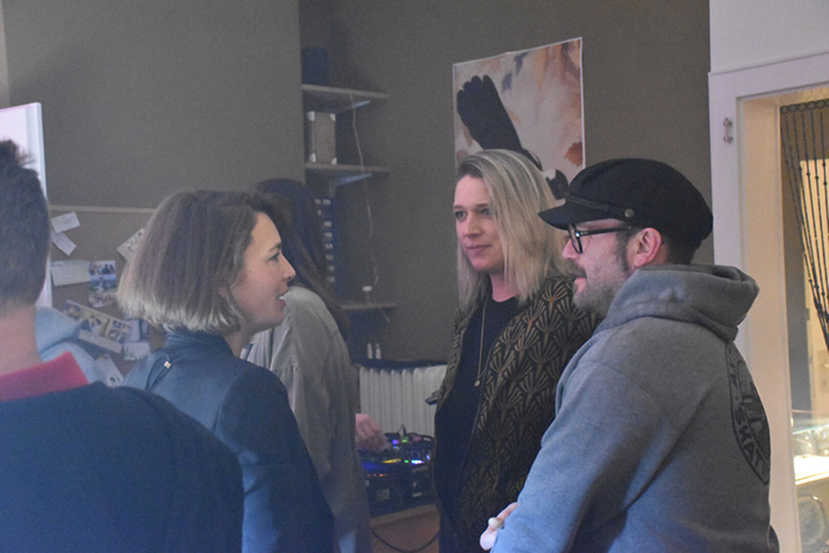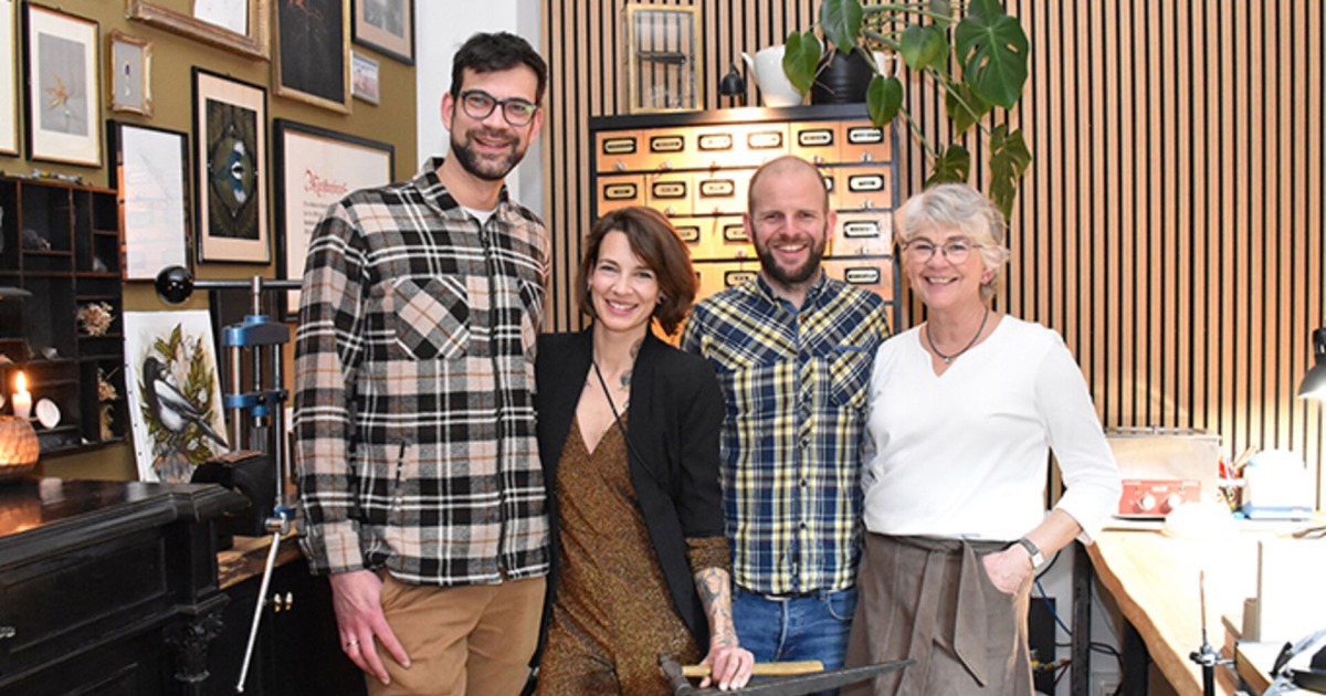 Gastgeberin und Goldschmiedemeisterin Katrin Eberhard mit Markus Andres (mi.), mit Bruder Simon Eberhard (li.) und Mama Ute Eberhard (re.)