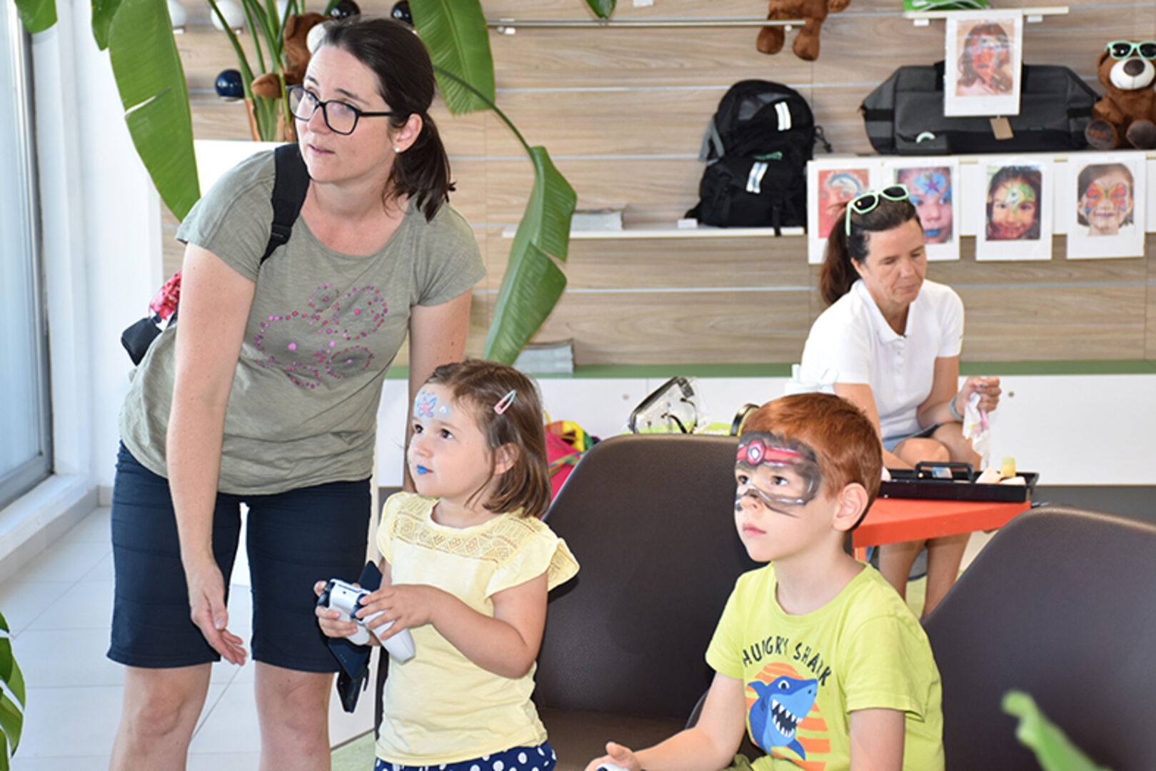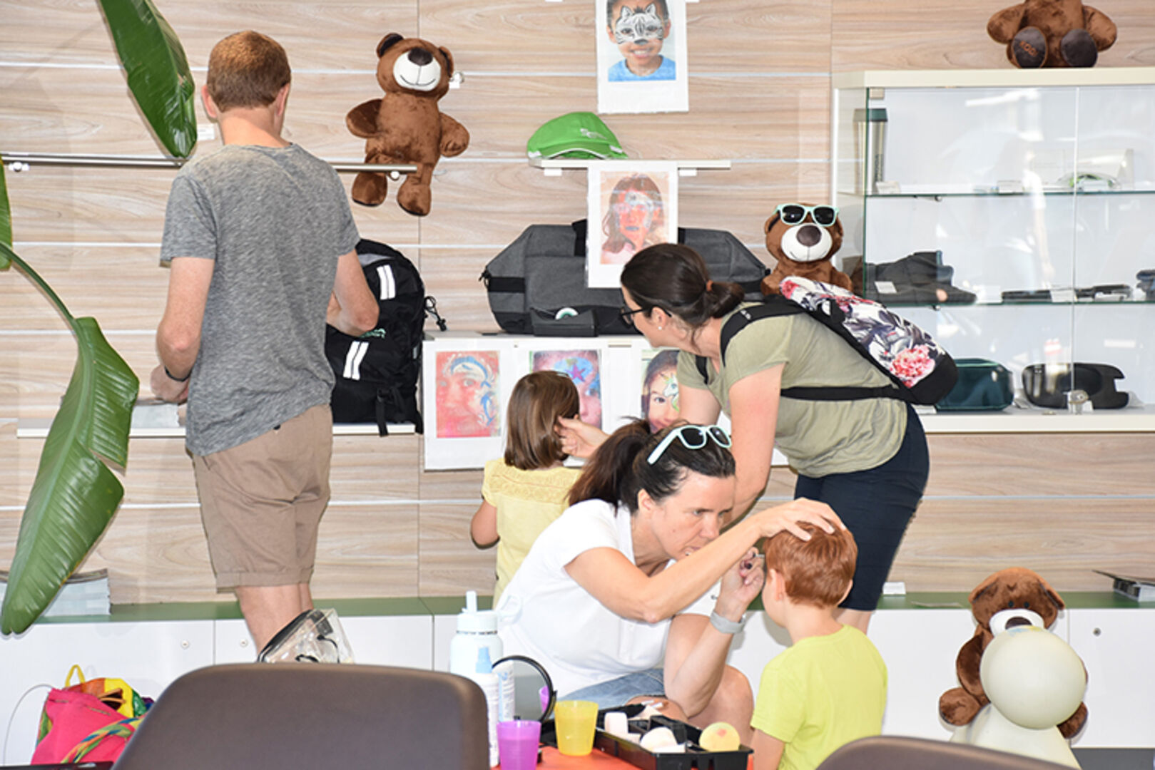Spaß beim Kinderschminken: Andrew und Anja Quinn mit Olivia und Oskar