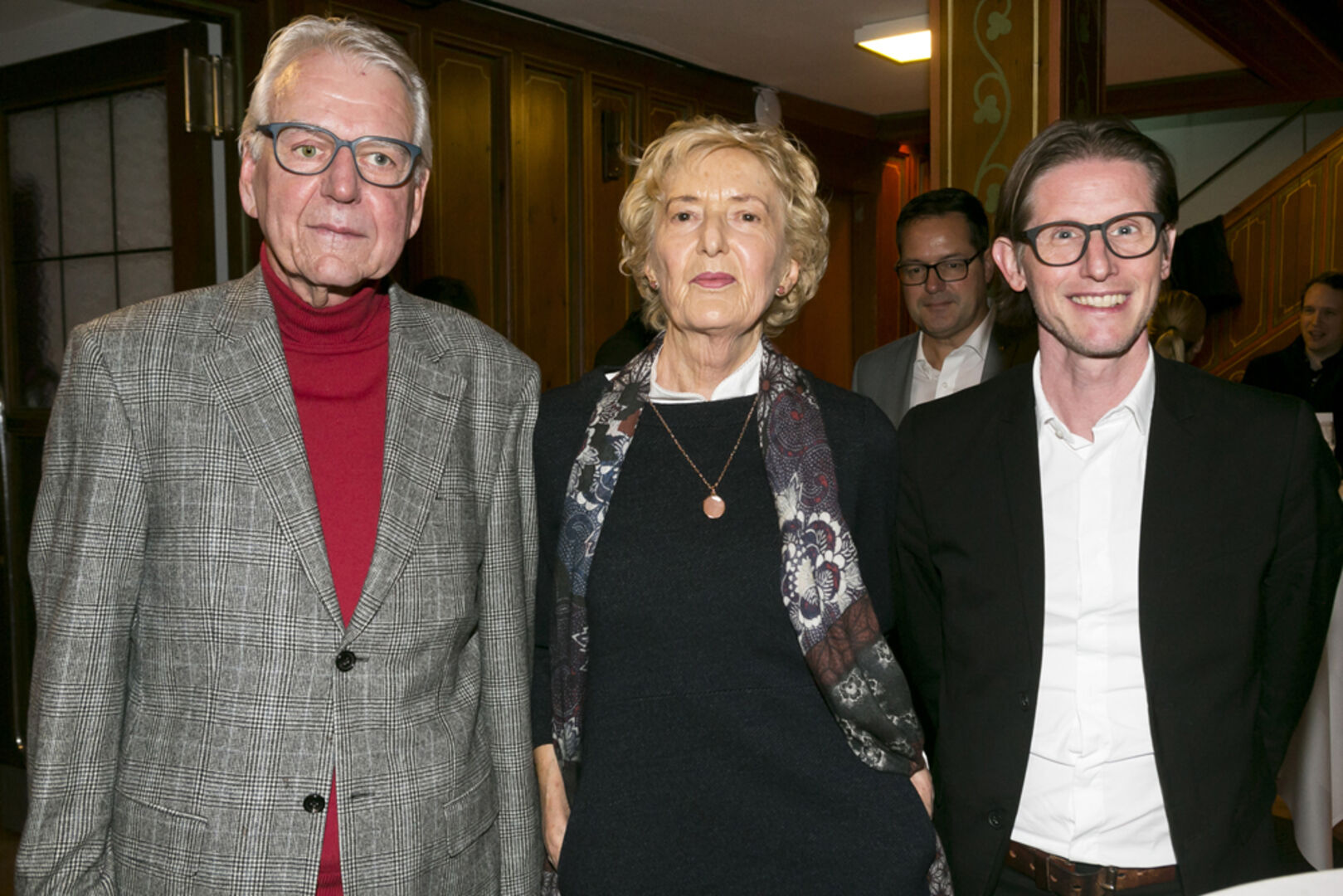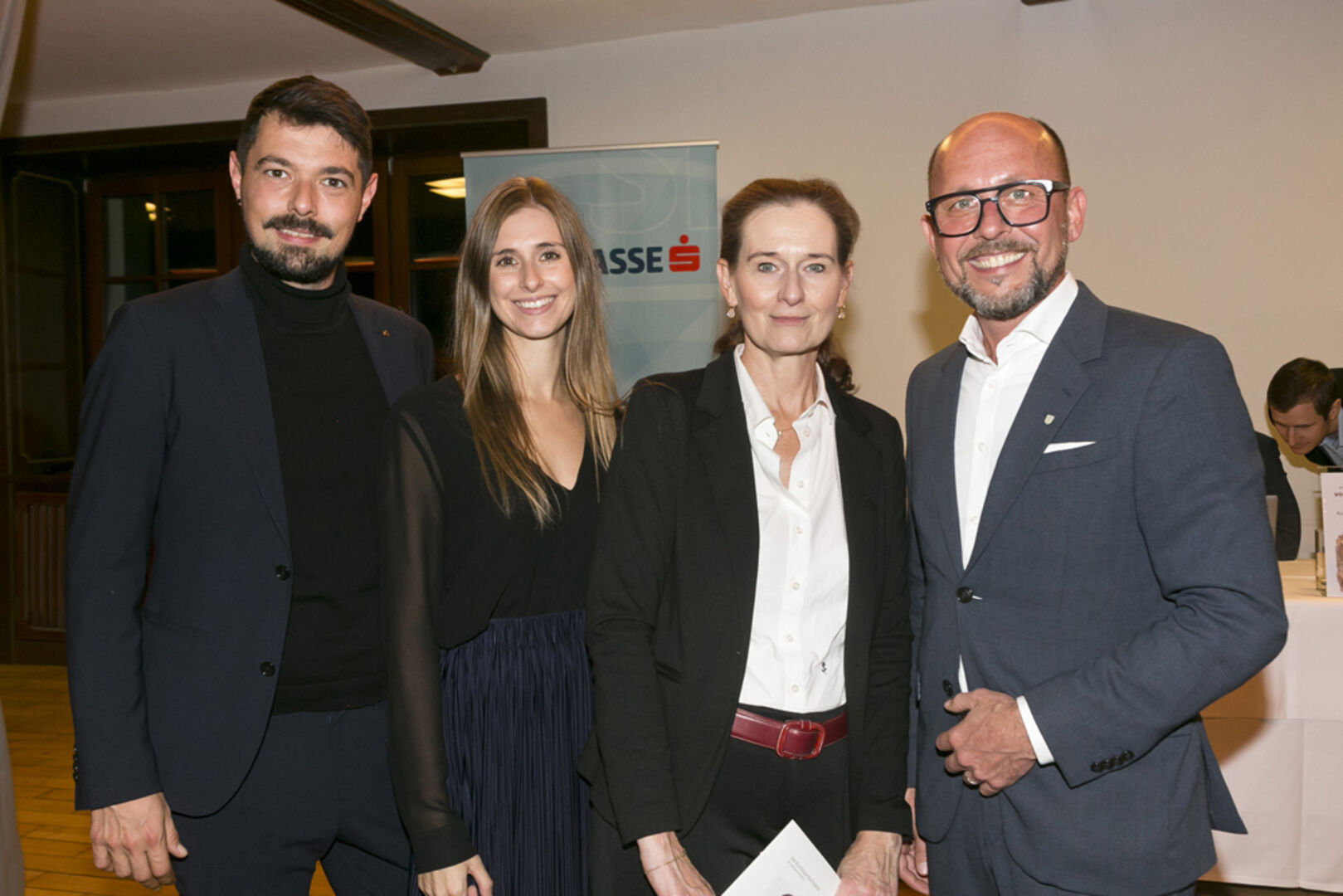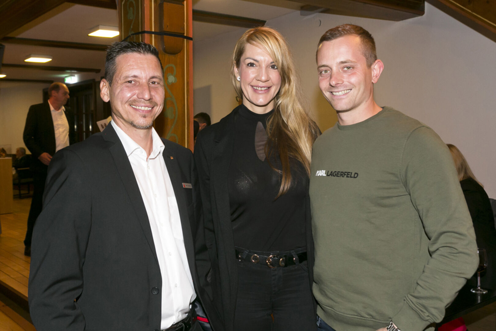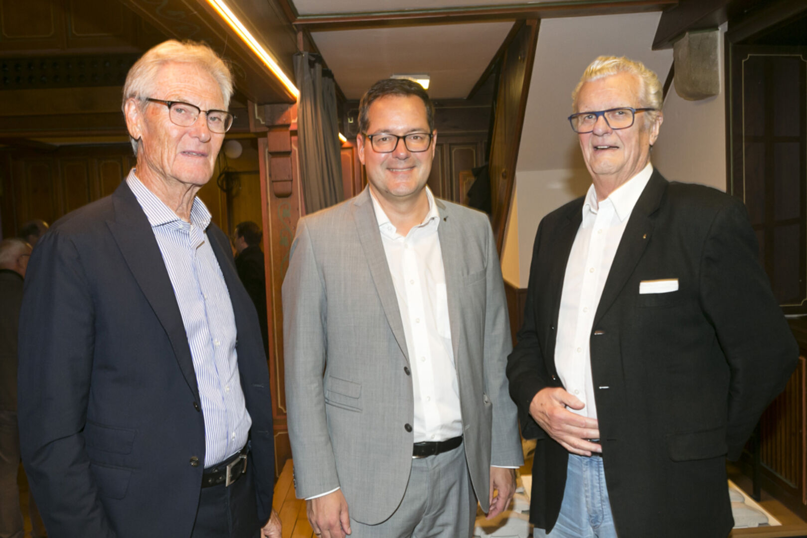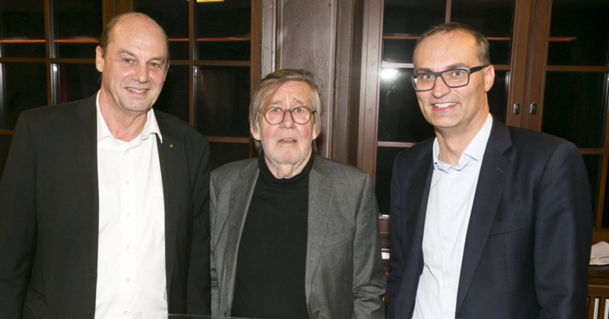 Die Vorstandsdirektoren der Sparkasse Bregenz Gerhard Lutz (li.) und Johannes Hämmerle (re.) mit Künstler und Gestalter des Kunstsparbuchs 2022 Gottfried Bechtold.