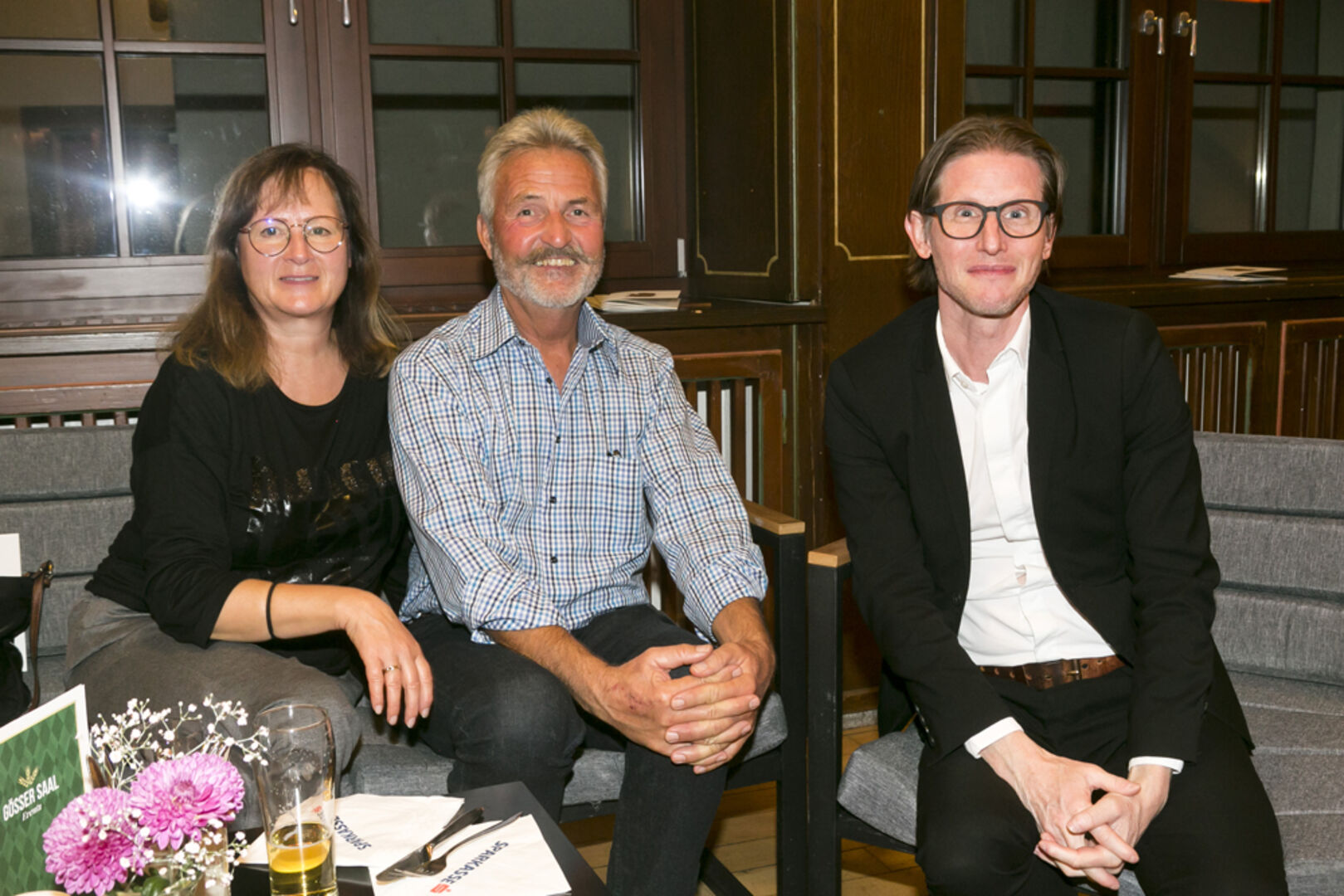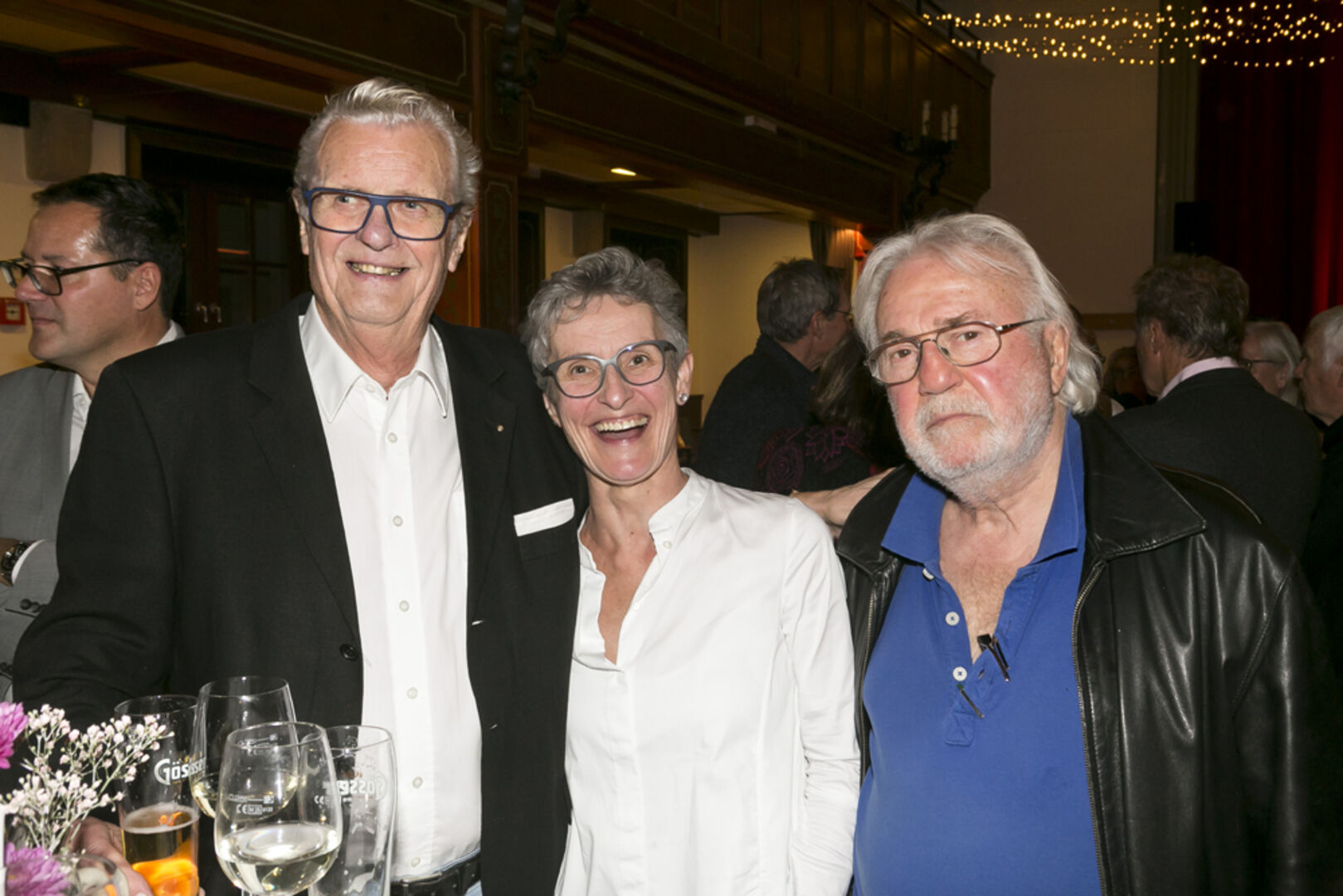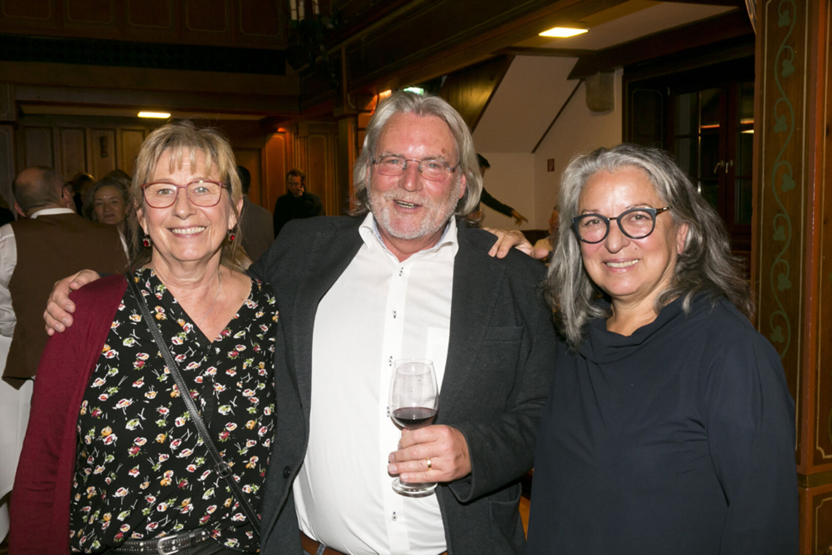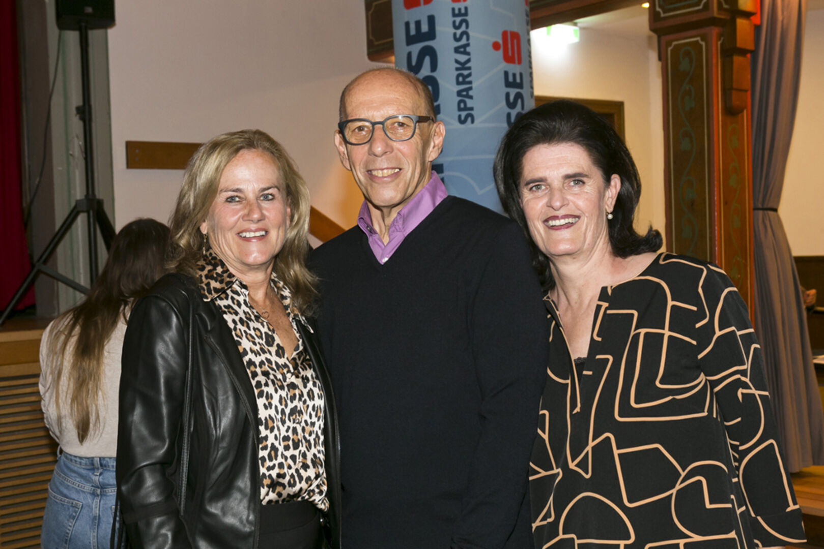 Die Vorstandsdirektoren der Sparkasse Bregenz Gerhard Lutz (li.) und Johannes Hämmerle (re.) mit Künstler und Gestalter des Kunstsparbuchs 2022 Gottfried Bechtold.